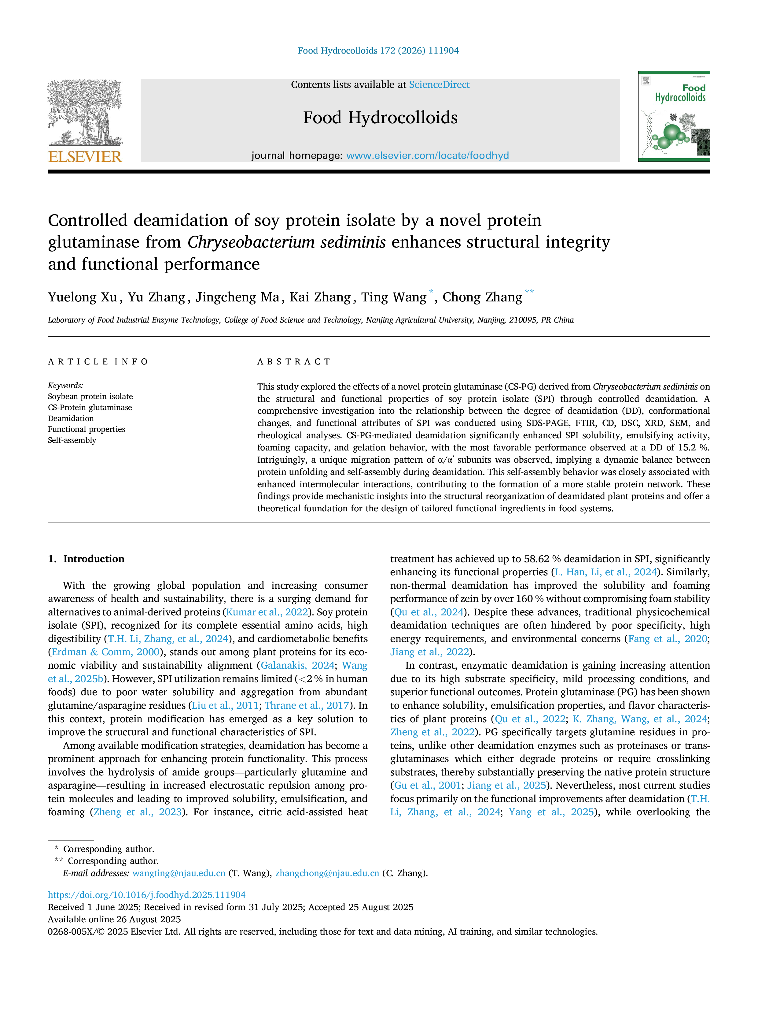 Controlled deamidation of soy protein isolate by a novel protein glutaminase from Chryseobacterium sediminis enhances structural integrity and functional performance