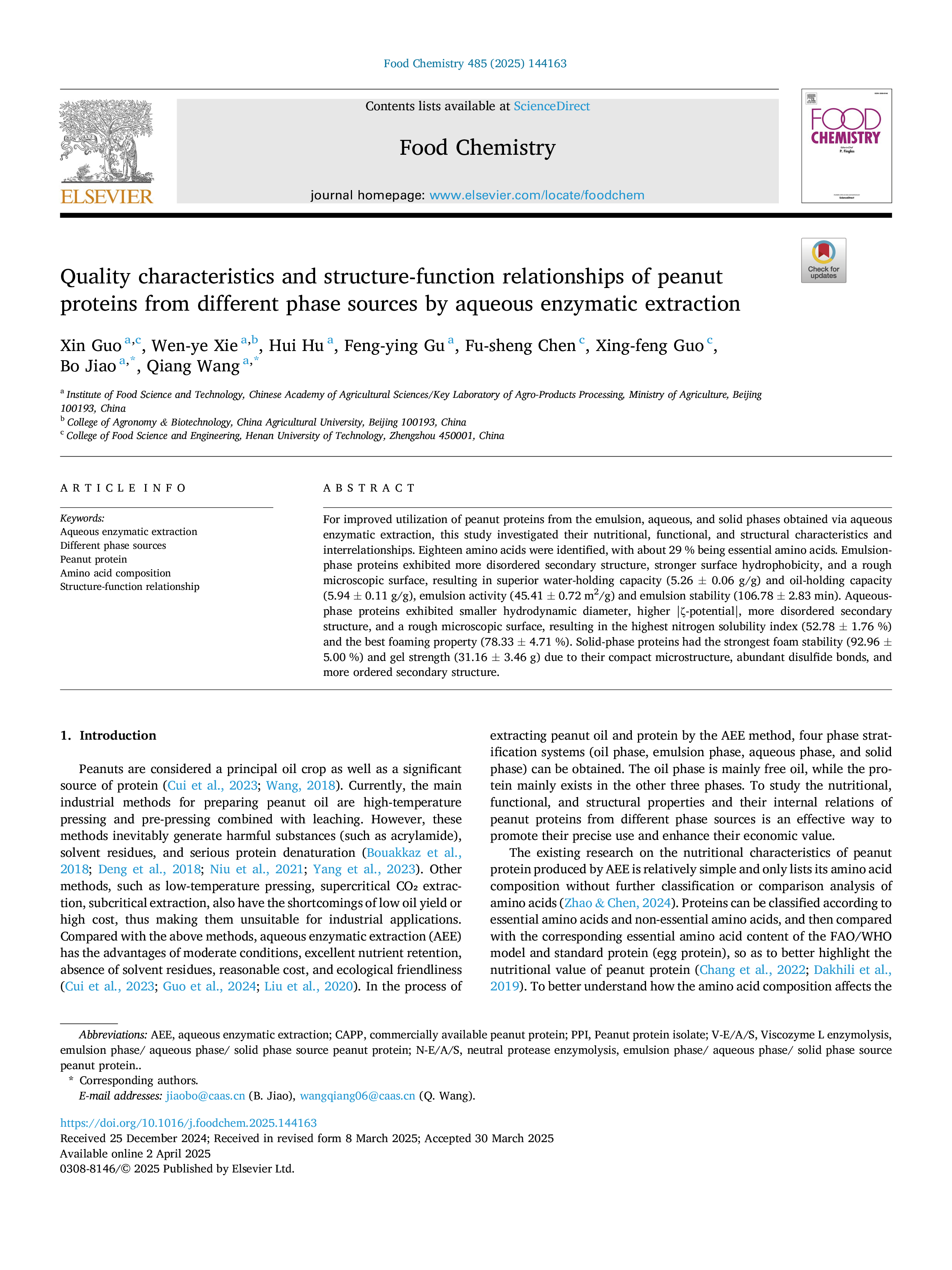 Quality characteristics and structure-function relationships of peanut proteins from different phase sources by aqueous enzymatic extraction