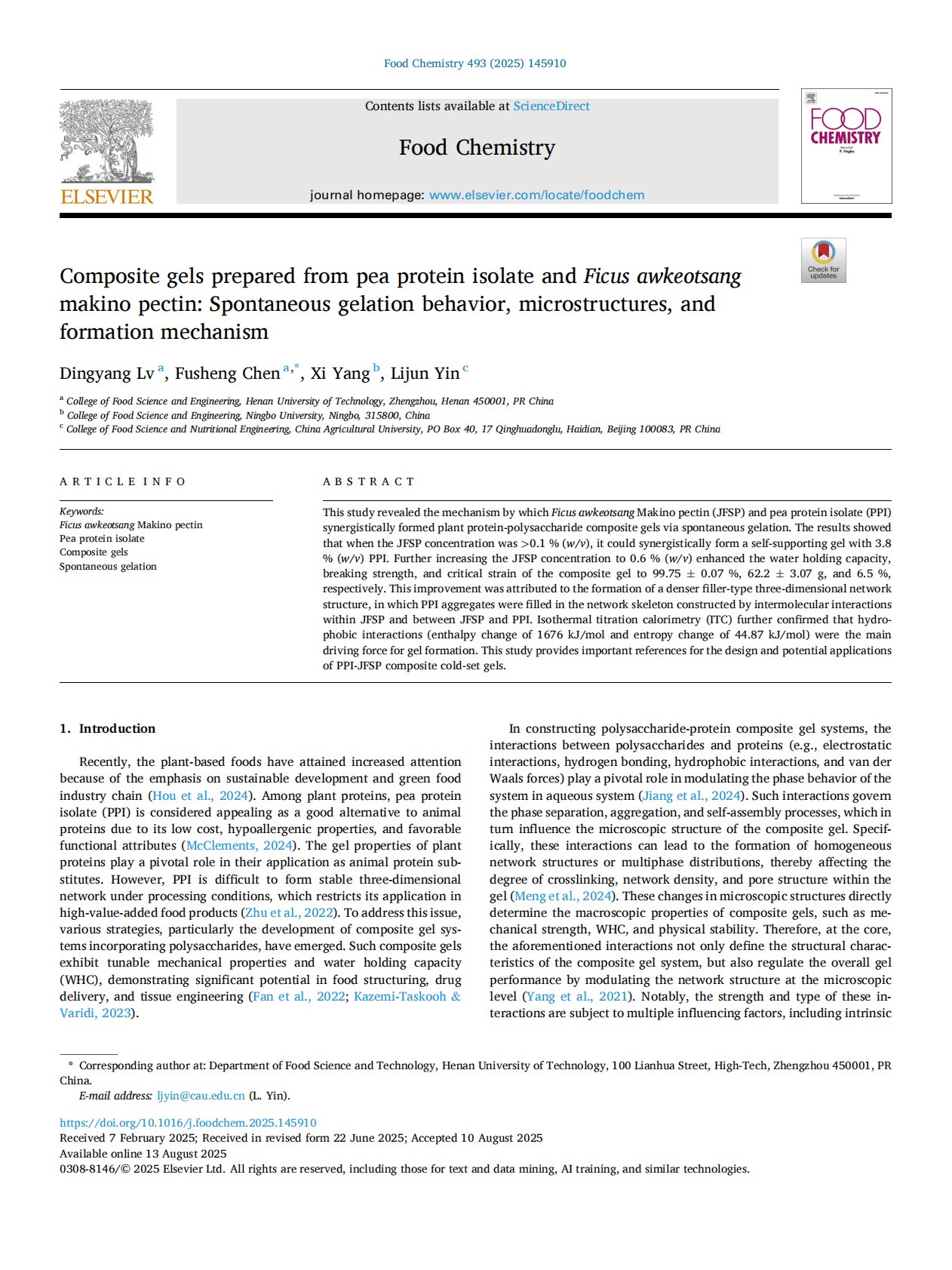 Composite gels prepared from pea protein isolate and Ficus awkeotsang makino pectin Spontaneous gelation behavior, microstructures, and formation mechanism