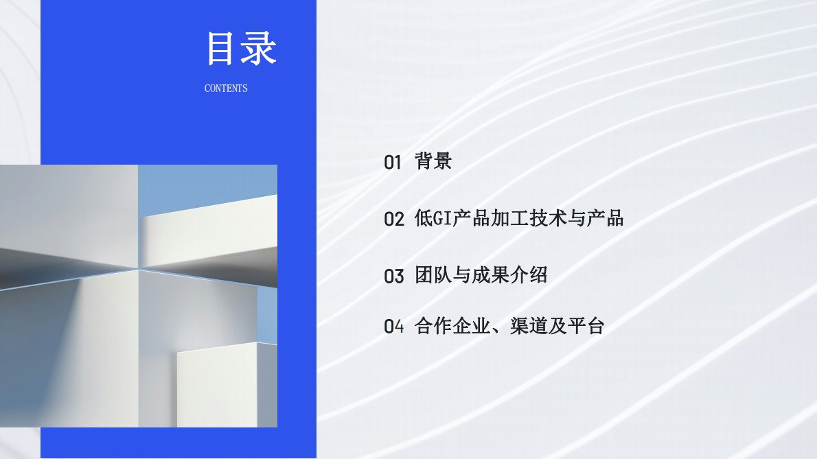 低GI产品加工关键技术研究与产业化示范 01 背景 02 低GI产品加工技术与产品 03 团队与成果介绍 04 合作企业、渠道及平台
