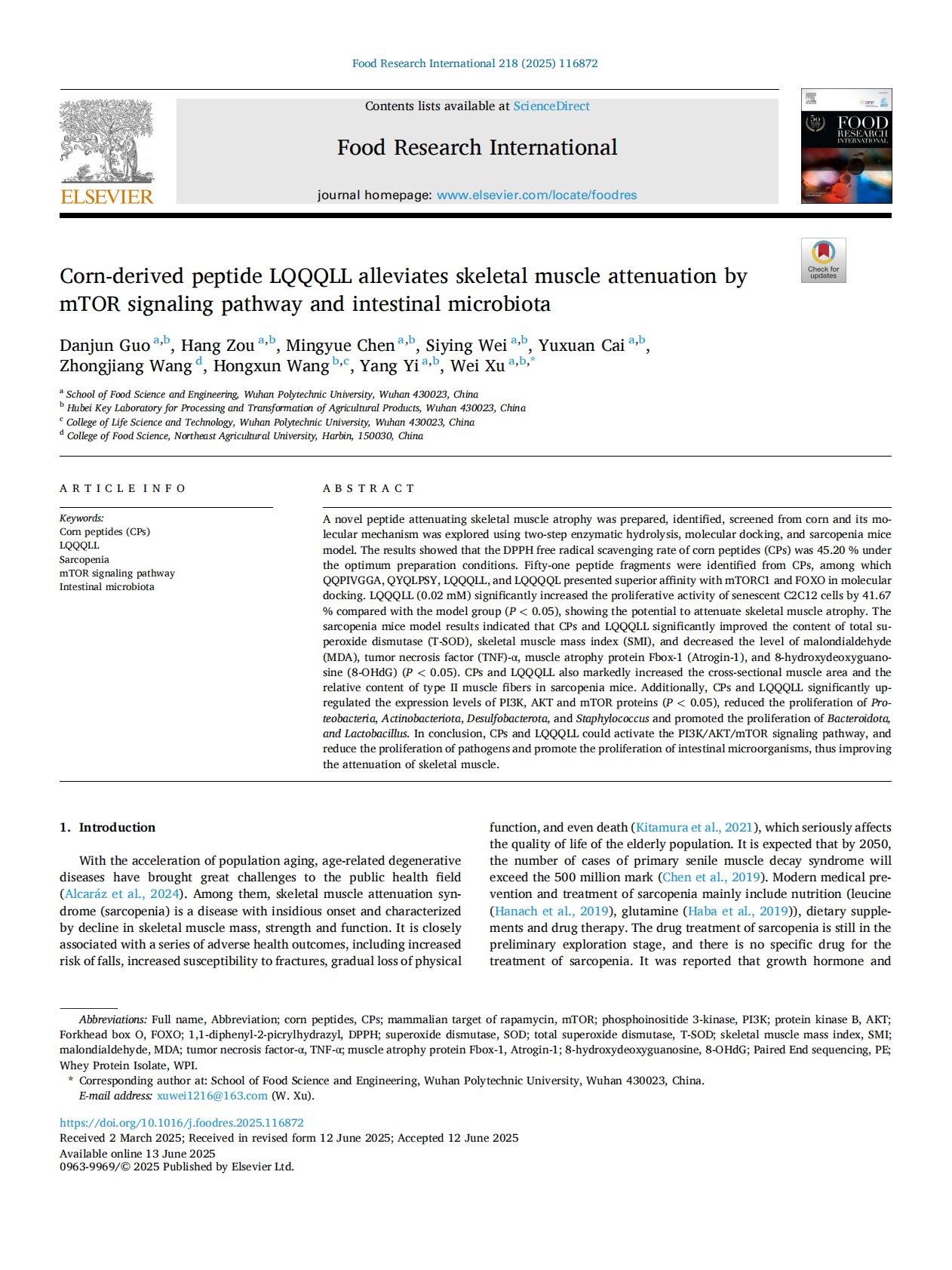 Corn-derived peptide LQQQLL alleviates skeletal muscle attenuation by mTOR signaling pathway and intestinal microbiota.pdf