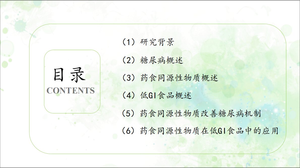 (1)研究背景;(2)糖尿病概述;(3)药食同源性物质概述;(4)低GI食品概述;(5)药食同源性物质改善糖尿病机制;(6)药食同源性物质在低GI食品中的应用
