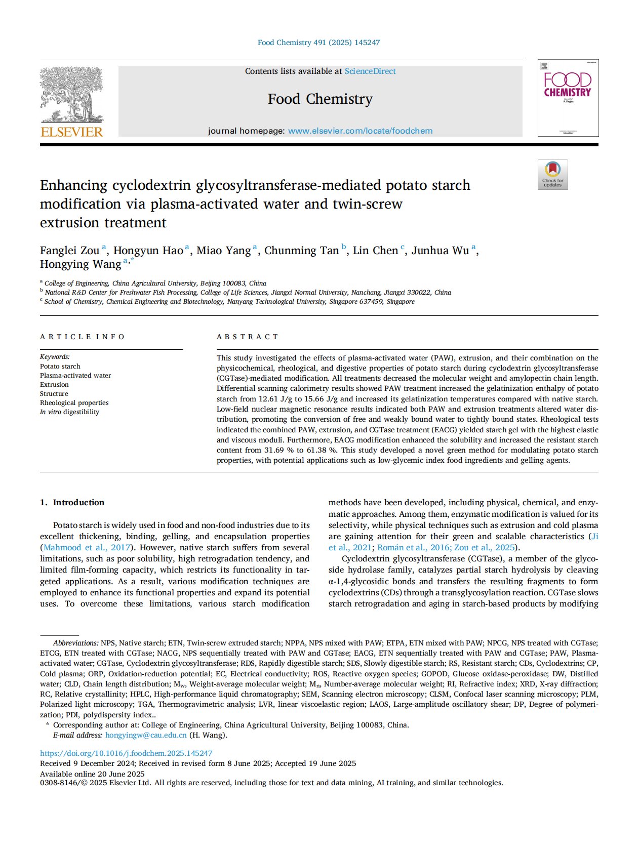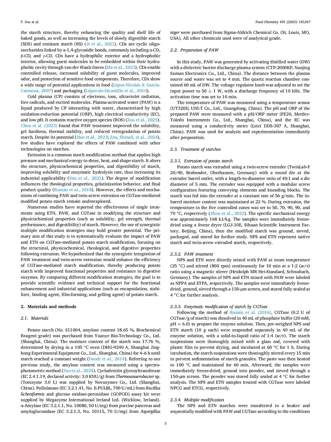 Enhancing cyclodextrin glycosyltransferase-mediated potato starch modification via plasma-activated water and twin-screw extrusion treatment