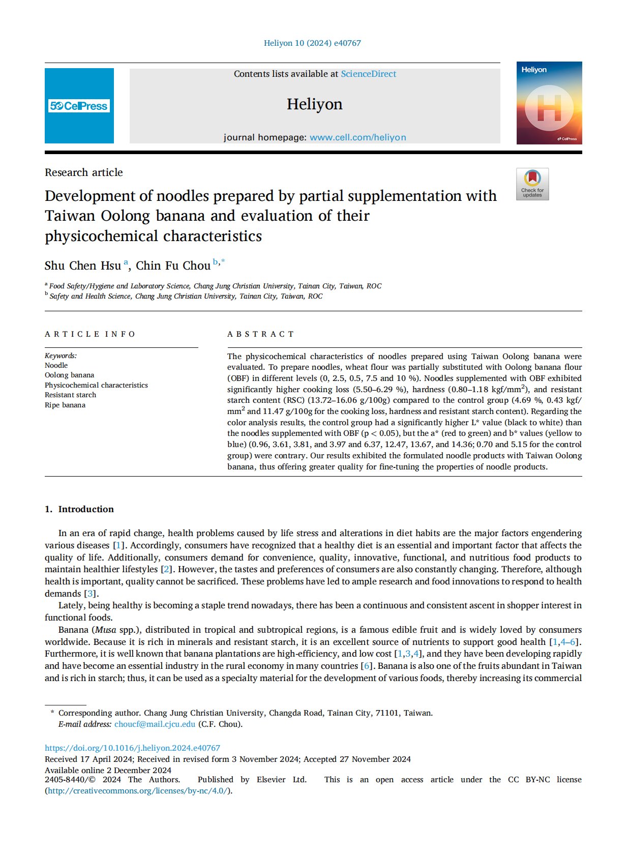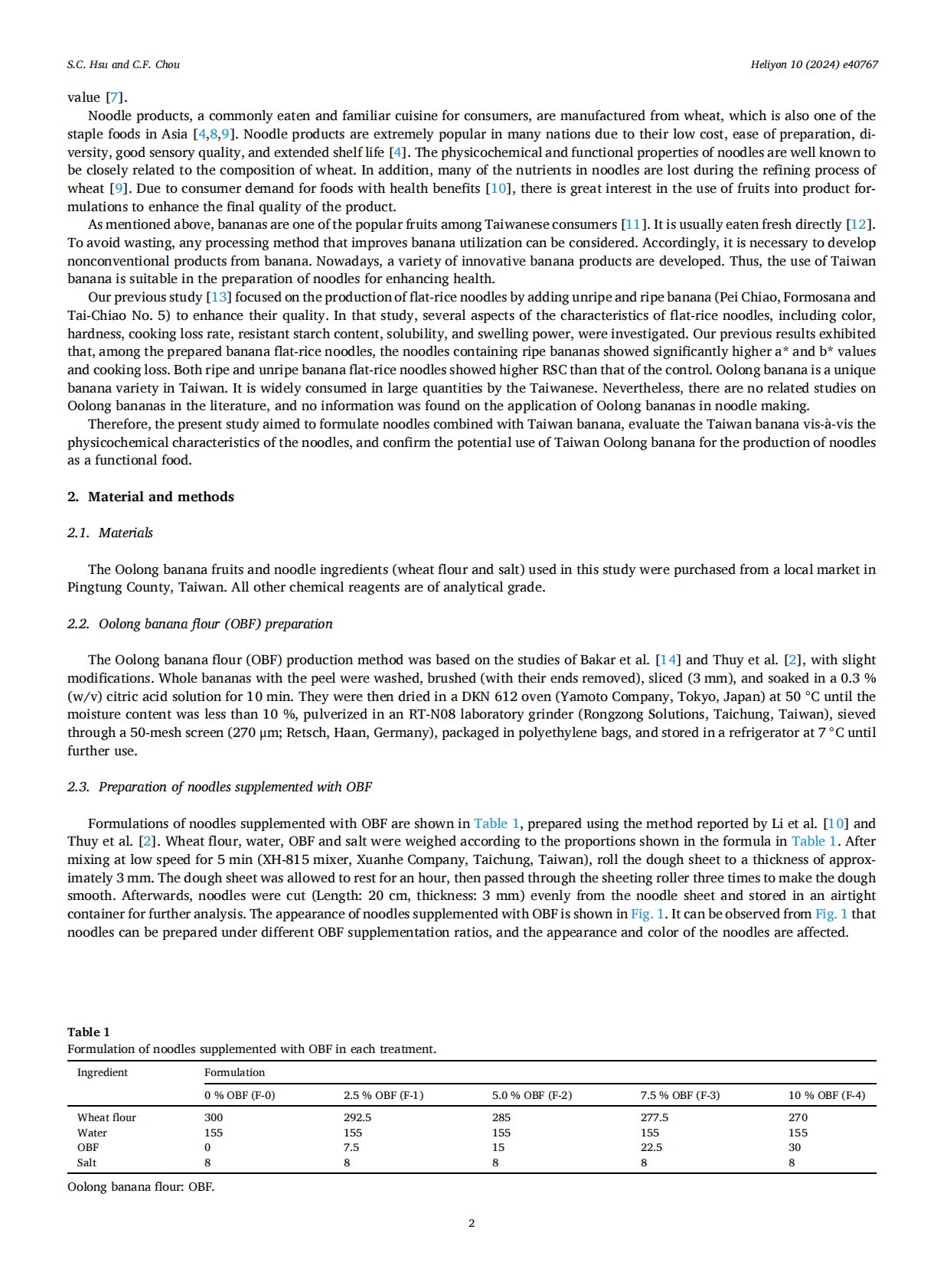 Development of noodles prepared by partial supplementation with Taiwan Oolong banana and evaluation of their physicochemical characteristics