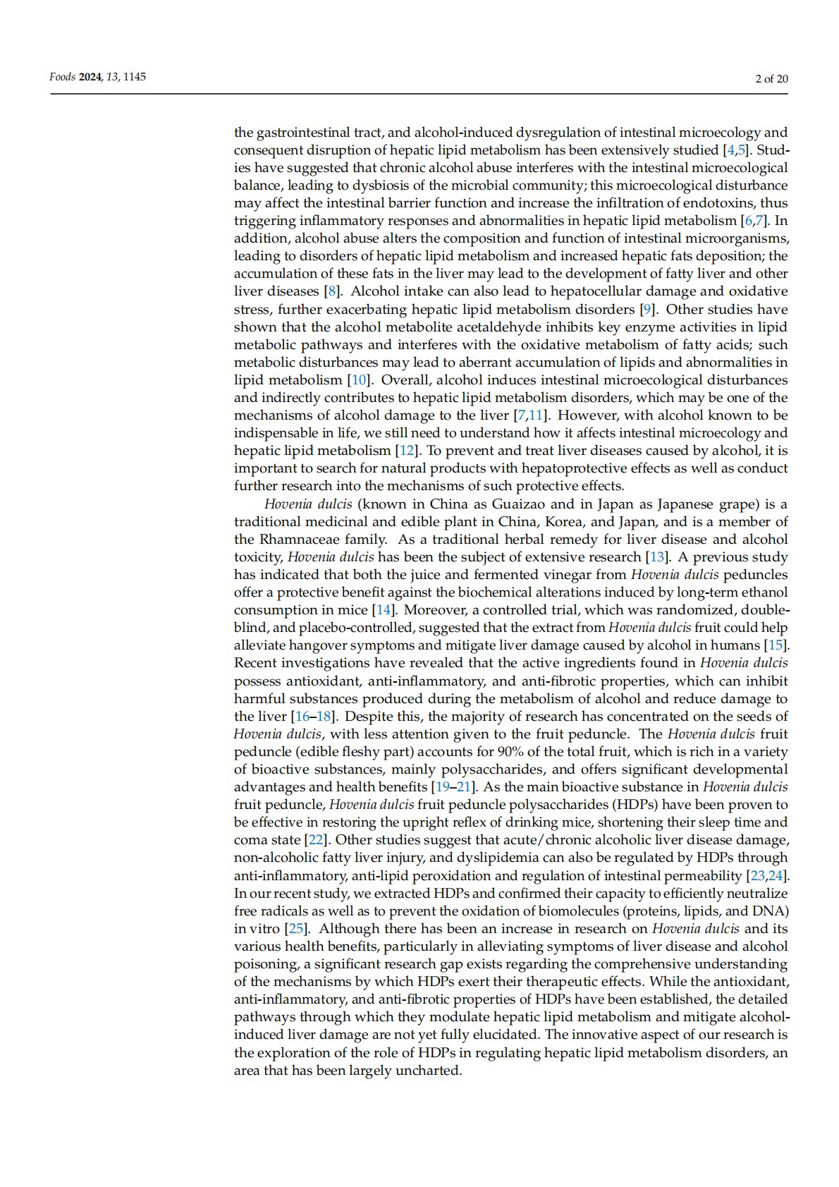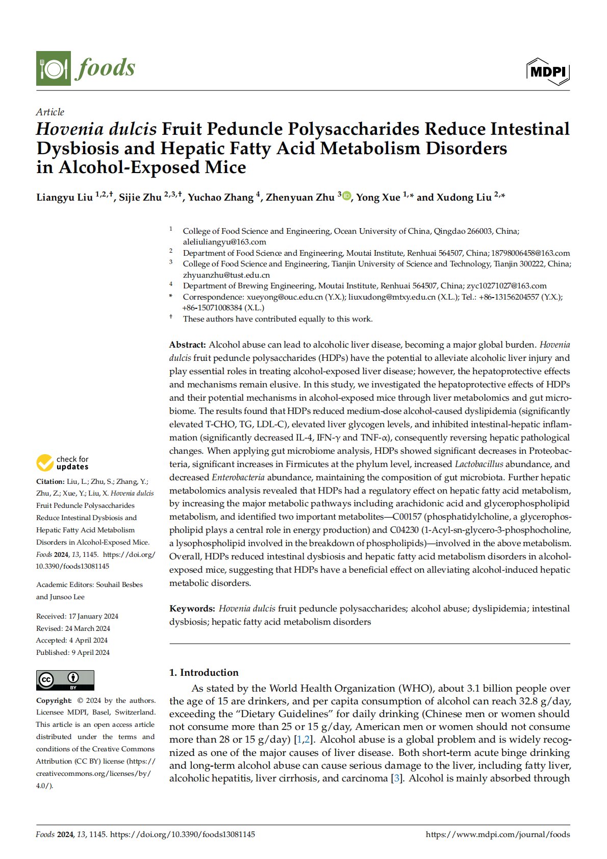 Hovenia dulcis Fruit Peduncle Polysaccharides Reduce Intestinal Dysbiosis and Hepatic Fatty Acid Metabolism Disorders in Alcohol-Exposed Mice