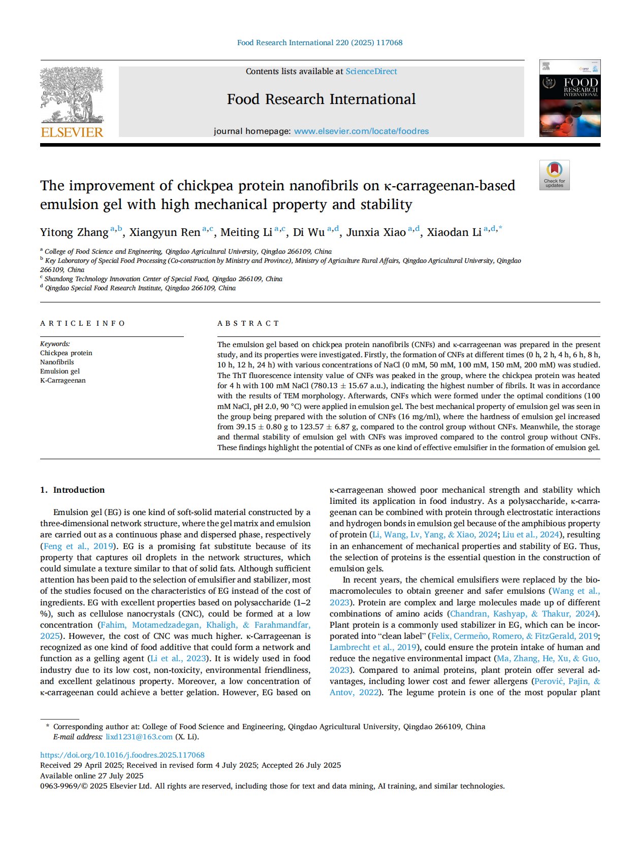 The improvement of chickpea protein nanofibrils on κ-carrageenan-based emulsion gel with high mechanical property and stability