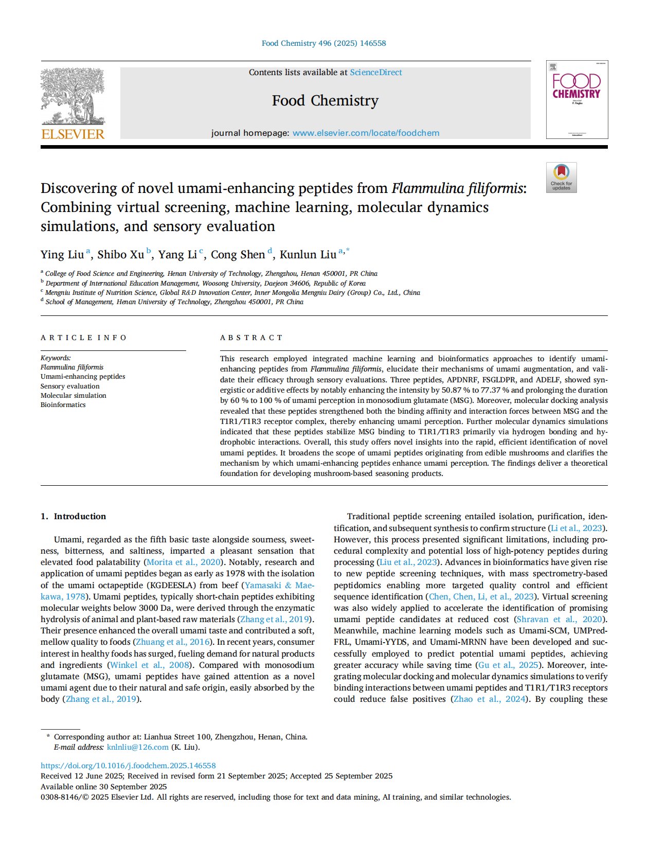 Discovering of novel umami-enhancing peptides from Flammulina filiformis_Combining virtual screening, machine learning, molecular dynamics simulations, and sensory evaluation