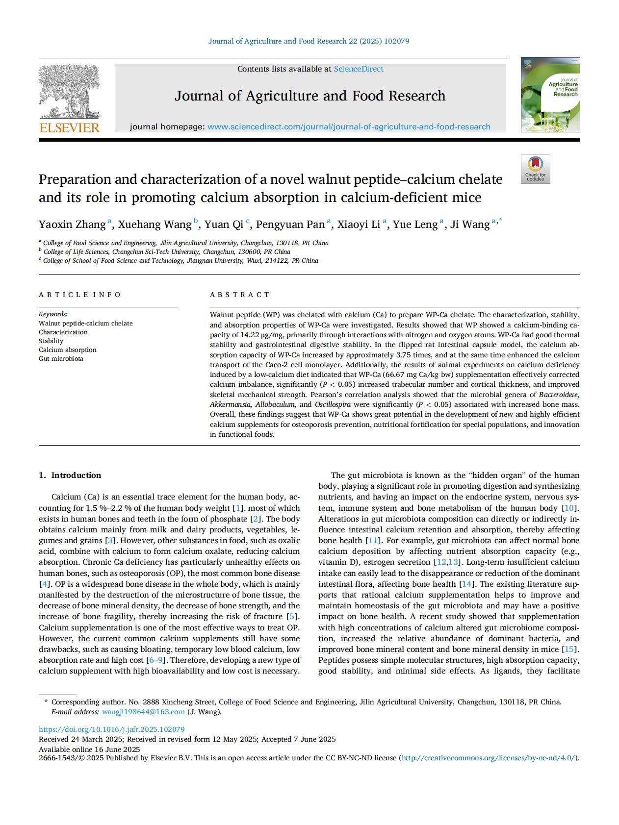 Preparation and characterization of a novel walnut peptide–calcium chelate and its role in promoting calcium absorption in calcium-deficient mice