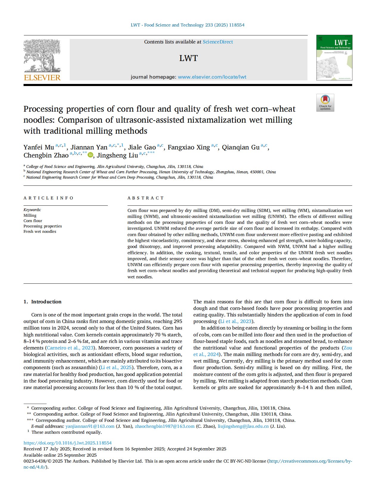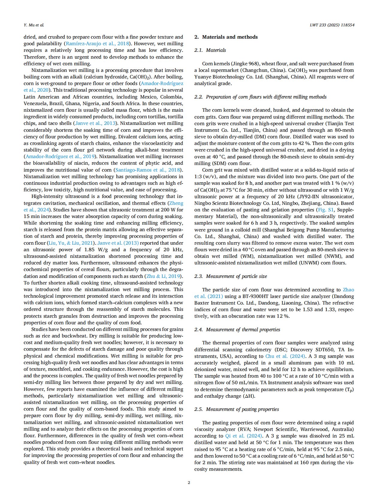 Processing properties of corn flour and quality of fresh wet corn–wheat noodles: Comparison of ultrasonic-assisted nixtamalization wet milling with traditional milling methods