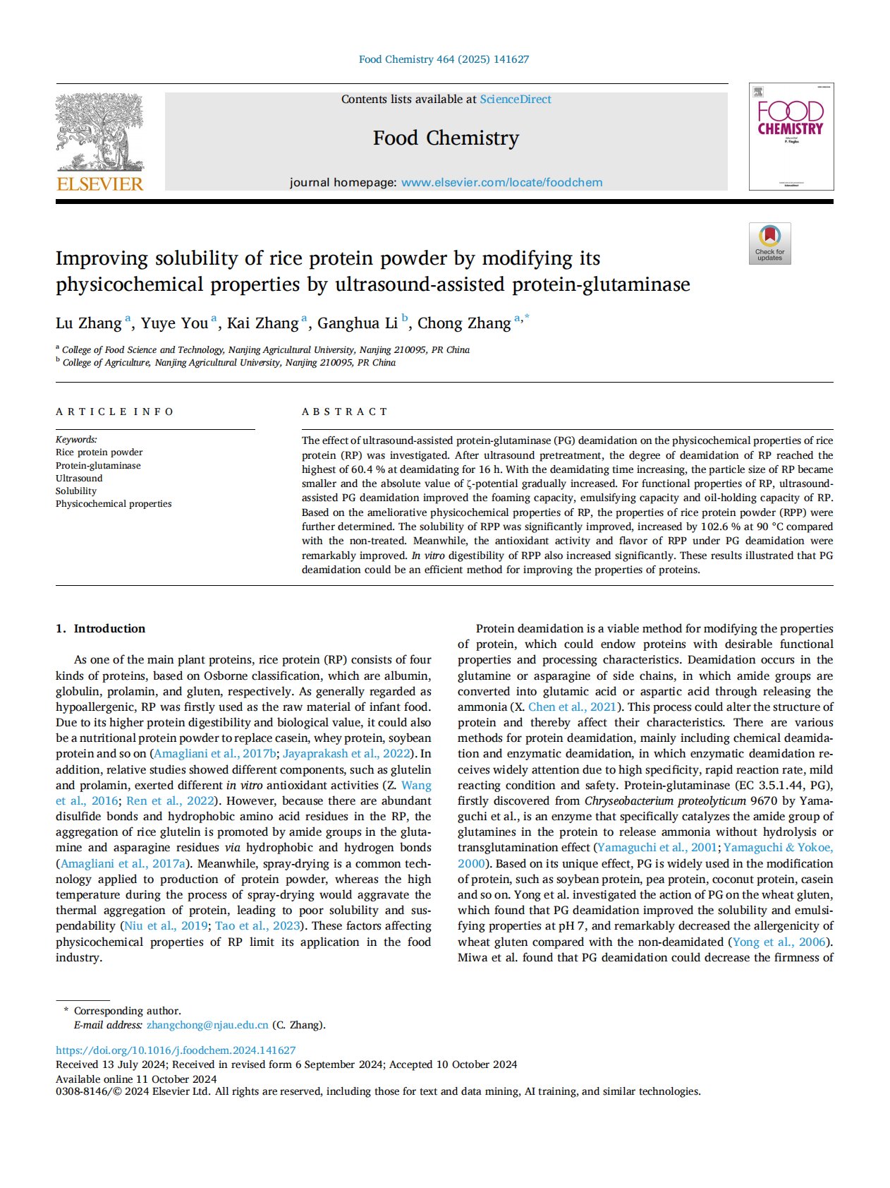 Improving solubility of rice protein powder by modifying its physicochemical properties by ultrasound-assisted protein-glutaminase
