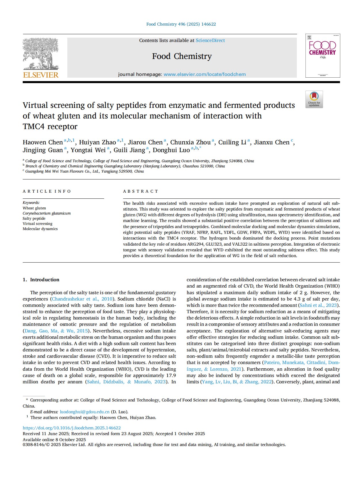 Molecular elucidation of the identification of novel saltiness-enhancing peptides and taste mechanism from soybean protein isolate based on transmembrane channel-like 4 (TMC4)1 知币4人下载