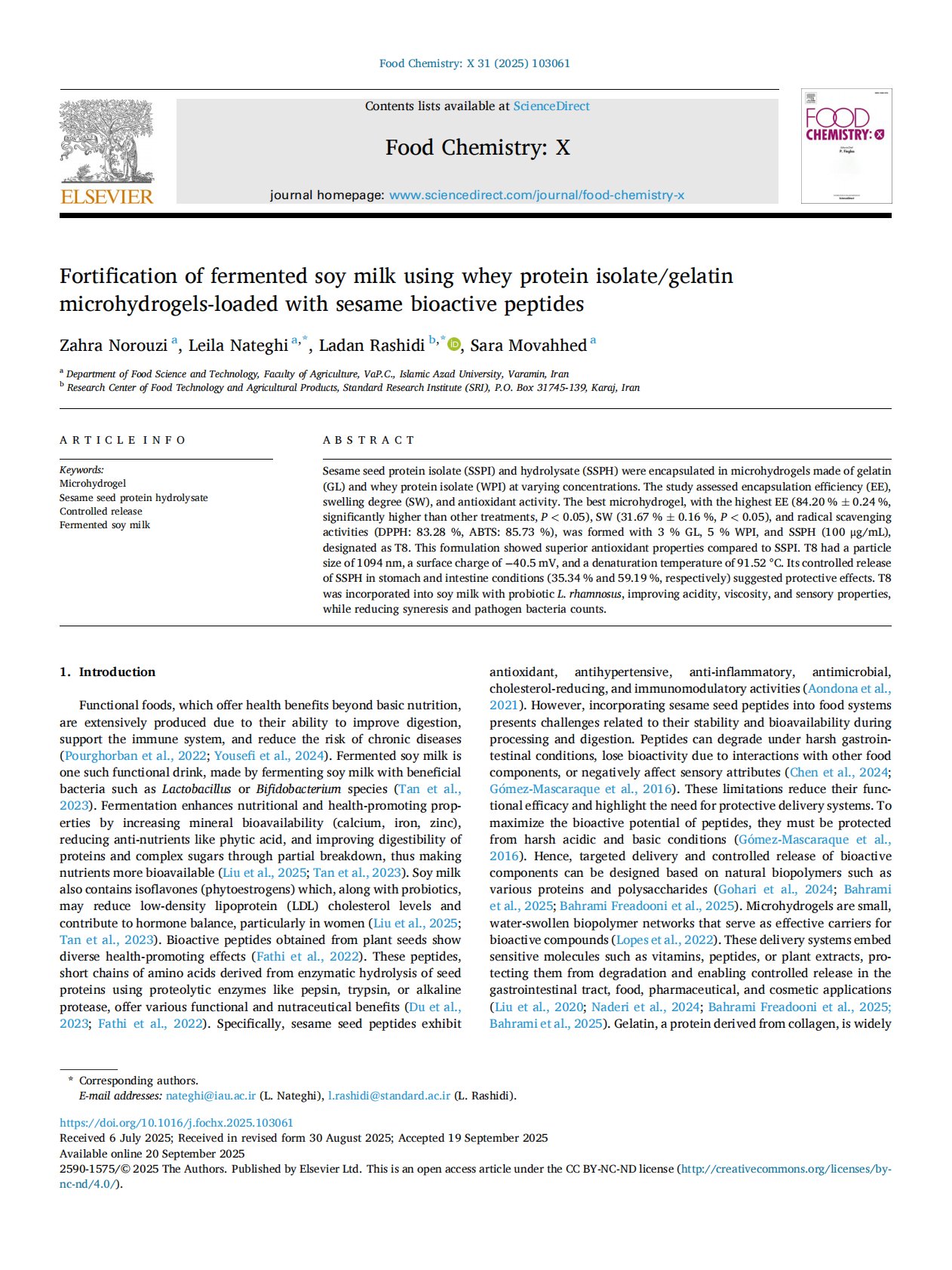 Fortification of fermented soy milk using whey protein isolategelatin microhydrogels-loaded with sesame bioactive peptides