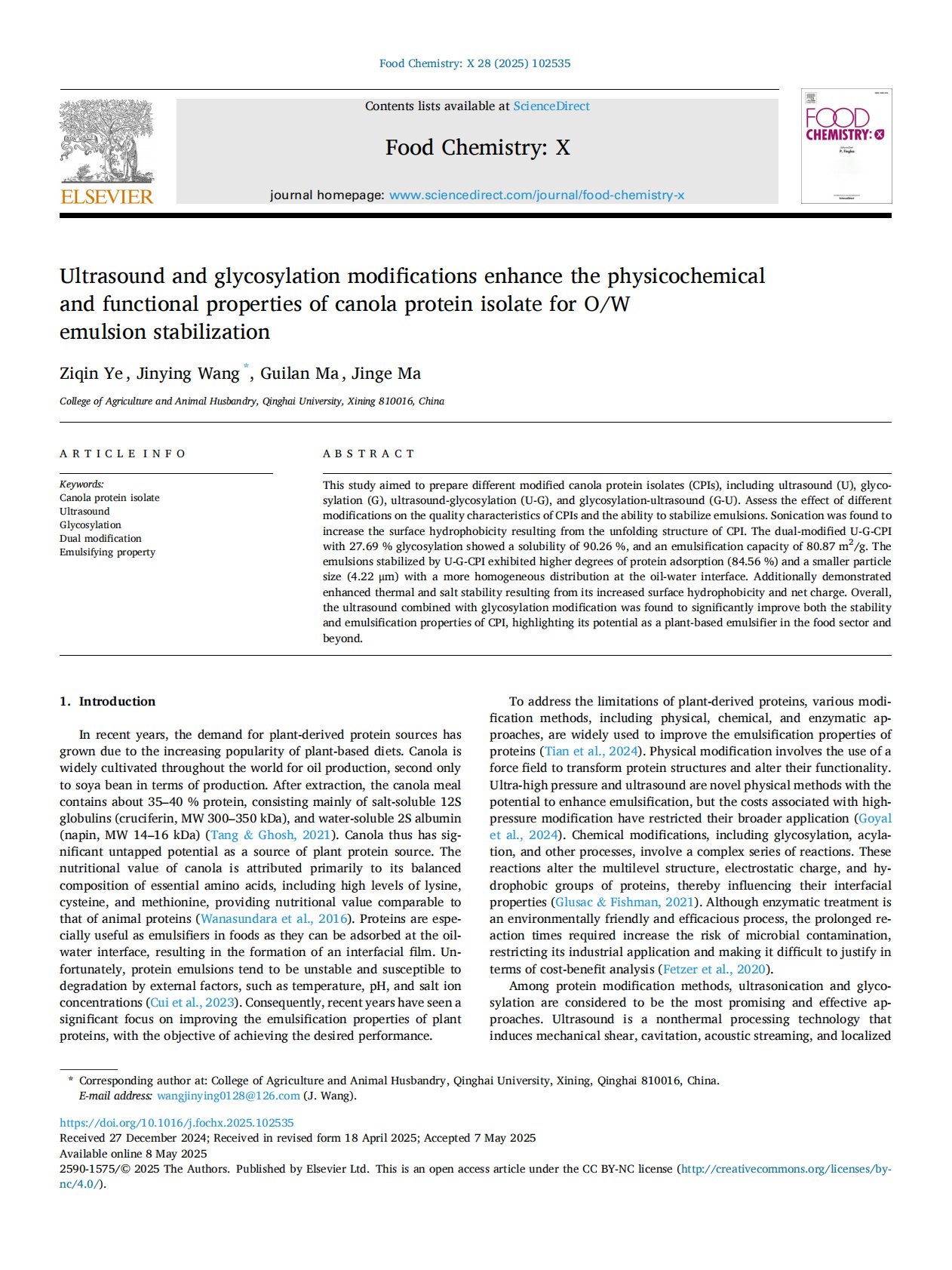 Ultrasound and glycosylation modifications enhance the physicochemical and functional properties of canola protein isolate for O/W emulsion stabilization