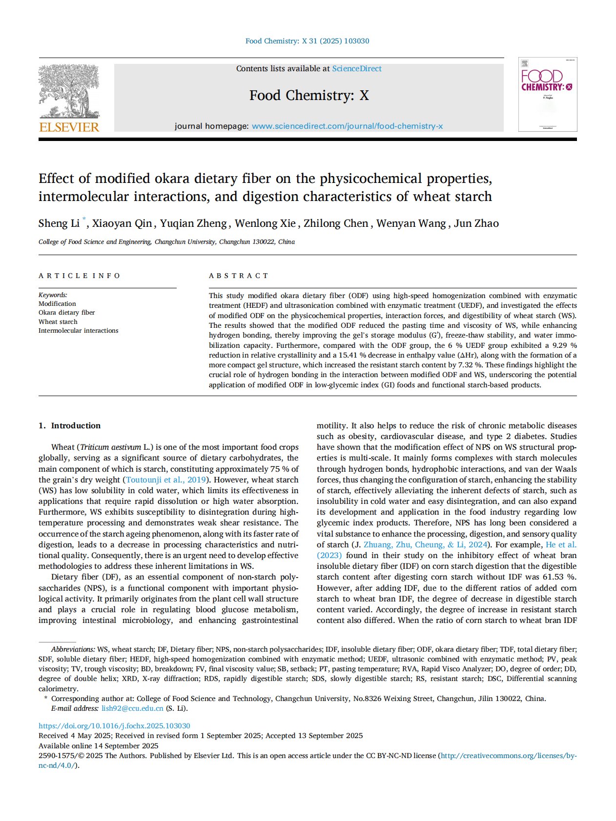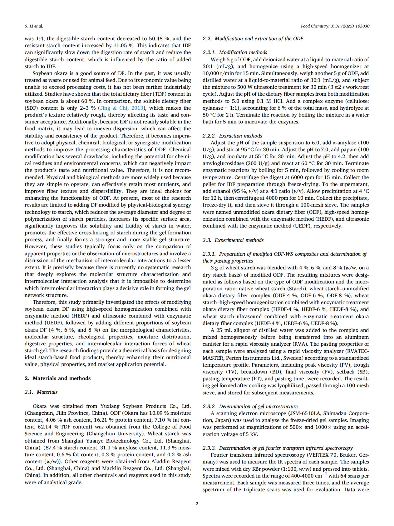 Effect of modified okara dietary fiber on the physicochemical properties, intermolecular interactions, and digestion characteristics of wheat starch