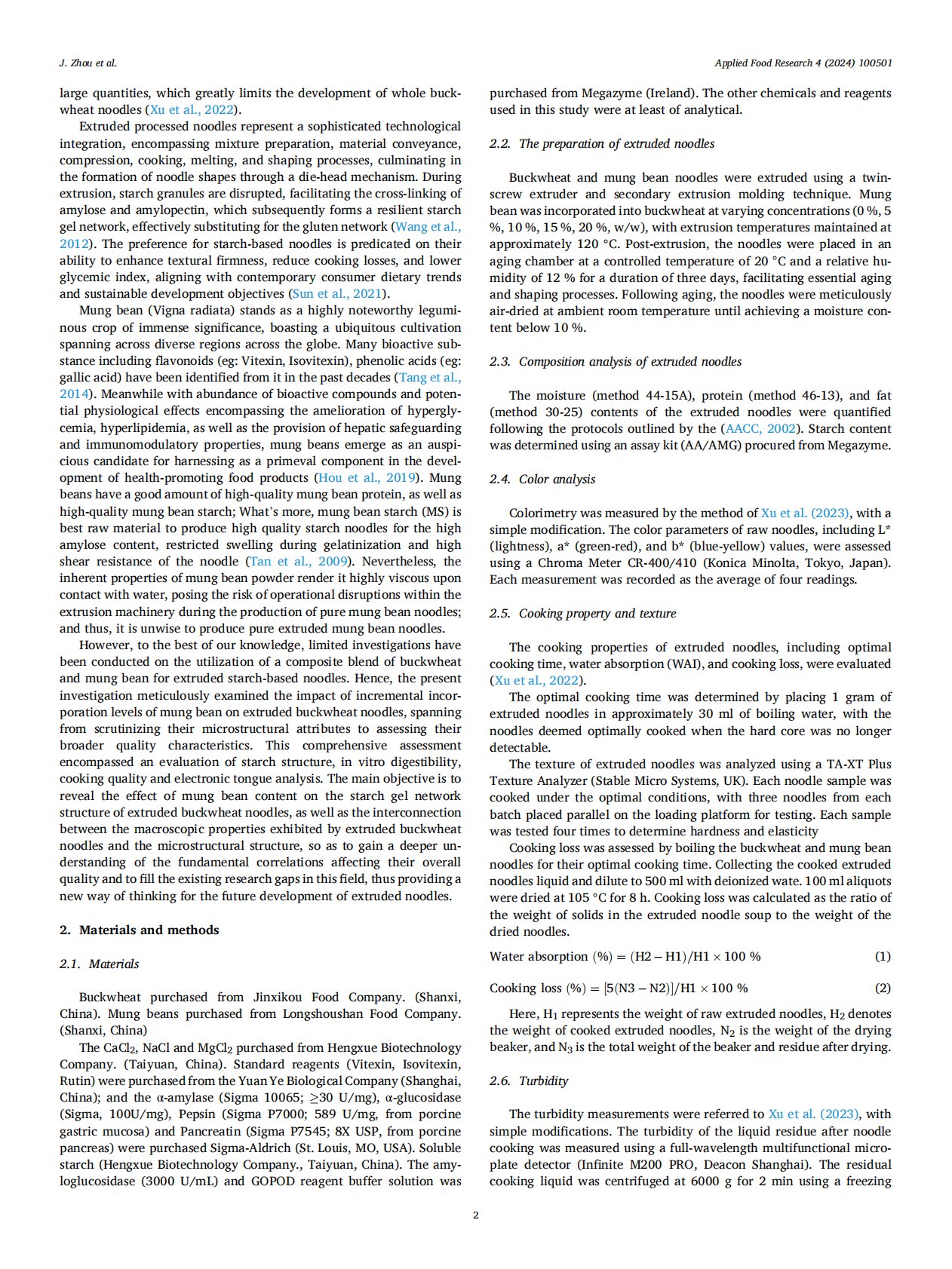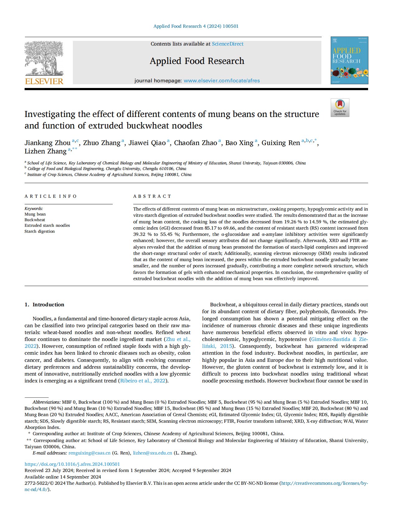 Investigating the effect of different contents of mung beans on the structure and function of extruded buckwheat noodles