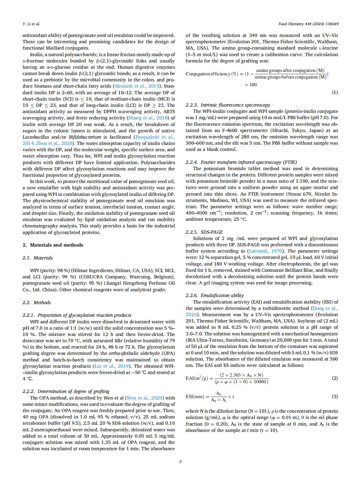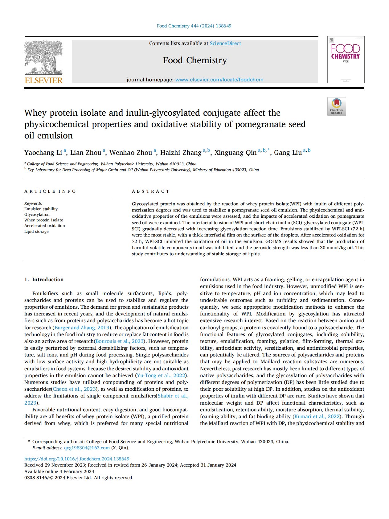 Whey protein isolate and inulin-glycosylated conjugateaffect the physicochemical properties and oxidative stabilityof pomegranate seed oil emulsion