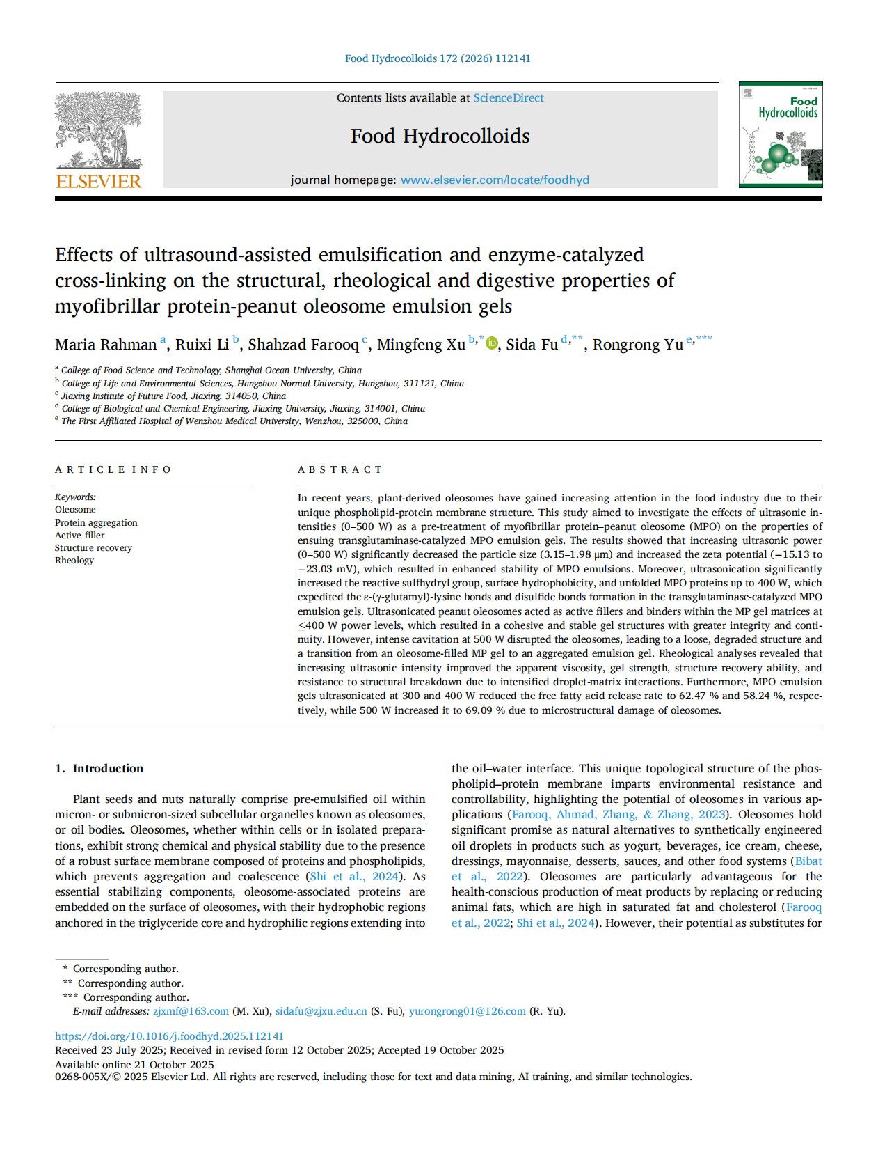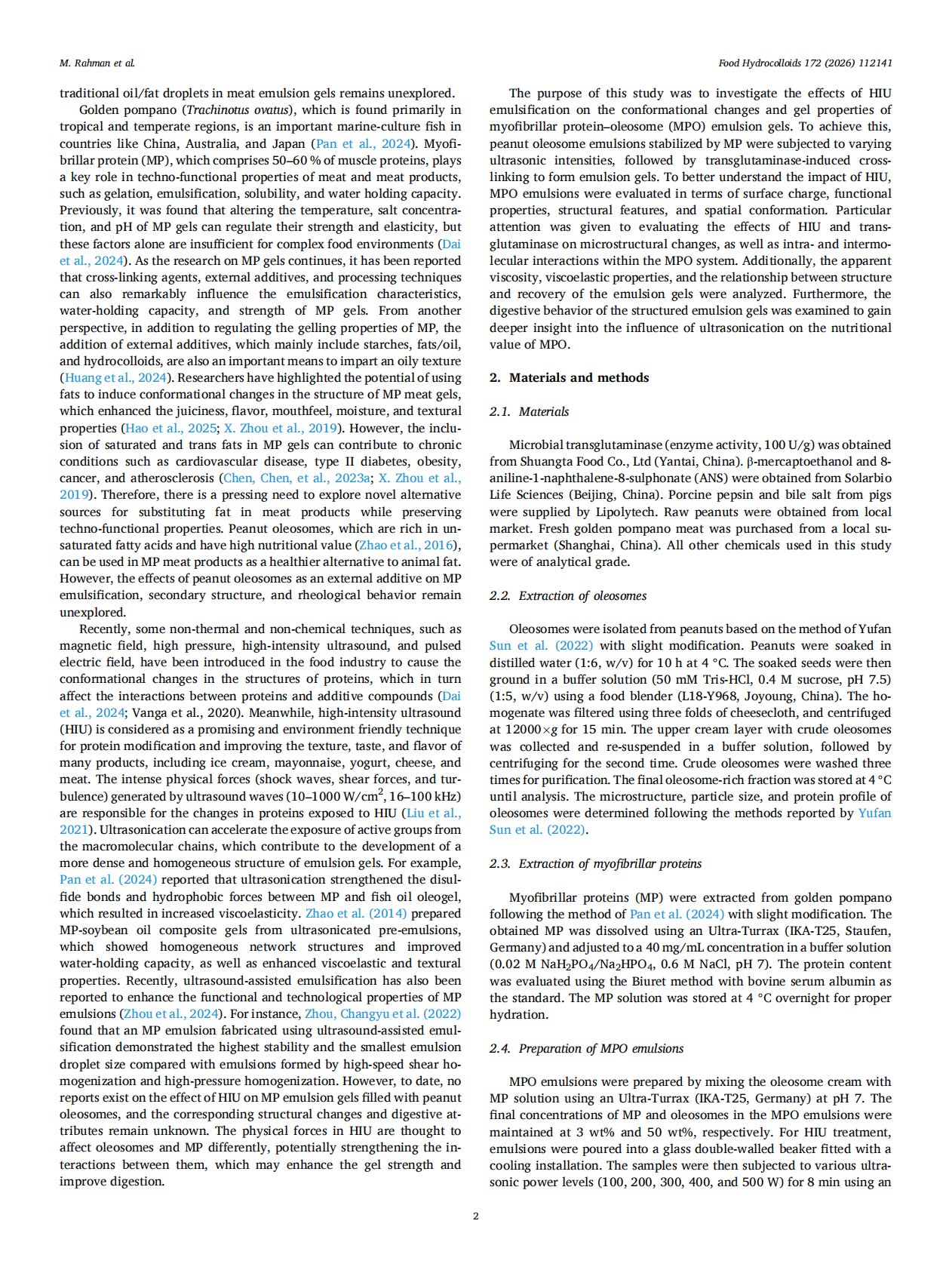 Effects of ultrasound-assisted emulsification and enzyme-catalyzed cross-linking on the structural, rheological and digestive properties of myofibrillar protein-peanut oleosome emulsion gels