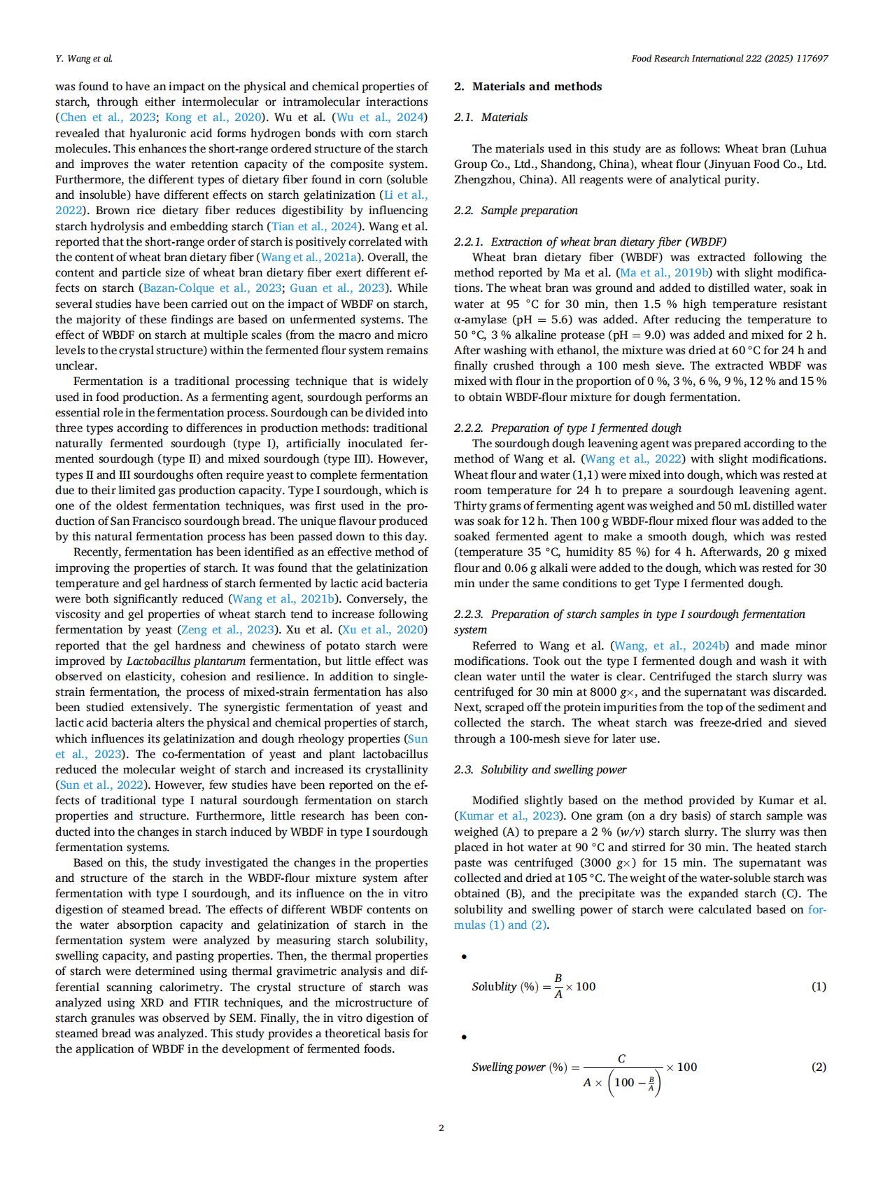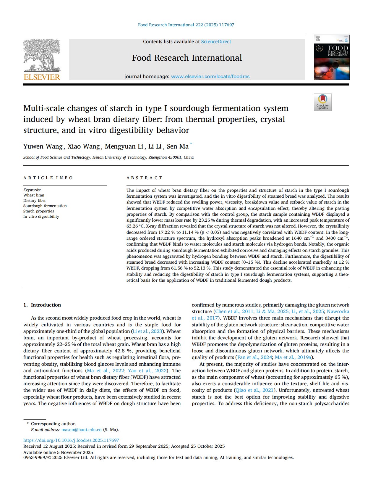 Multi-scale changes of starch in type I sourdough fermentation system induced by wheat bran dietary fiber from thermal properties, crystal structure, and in vitro digestibility behavior