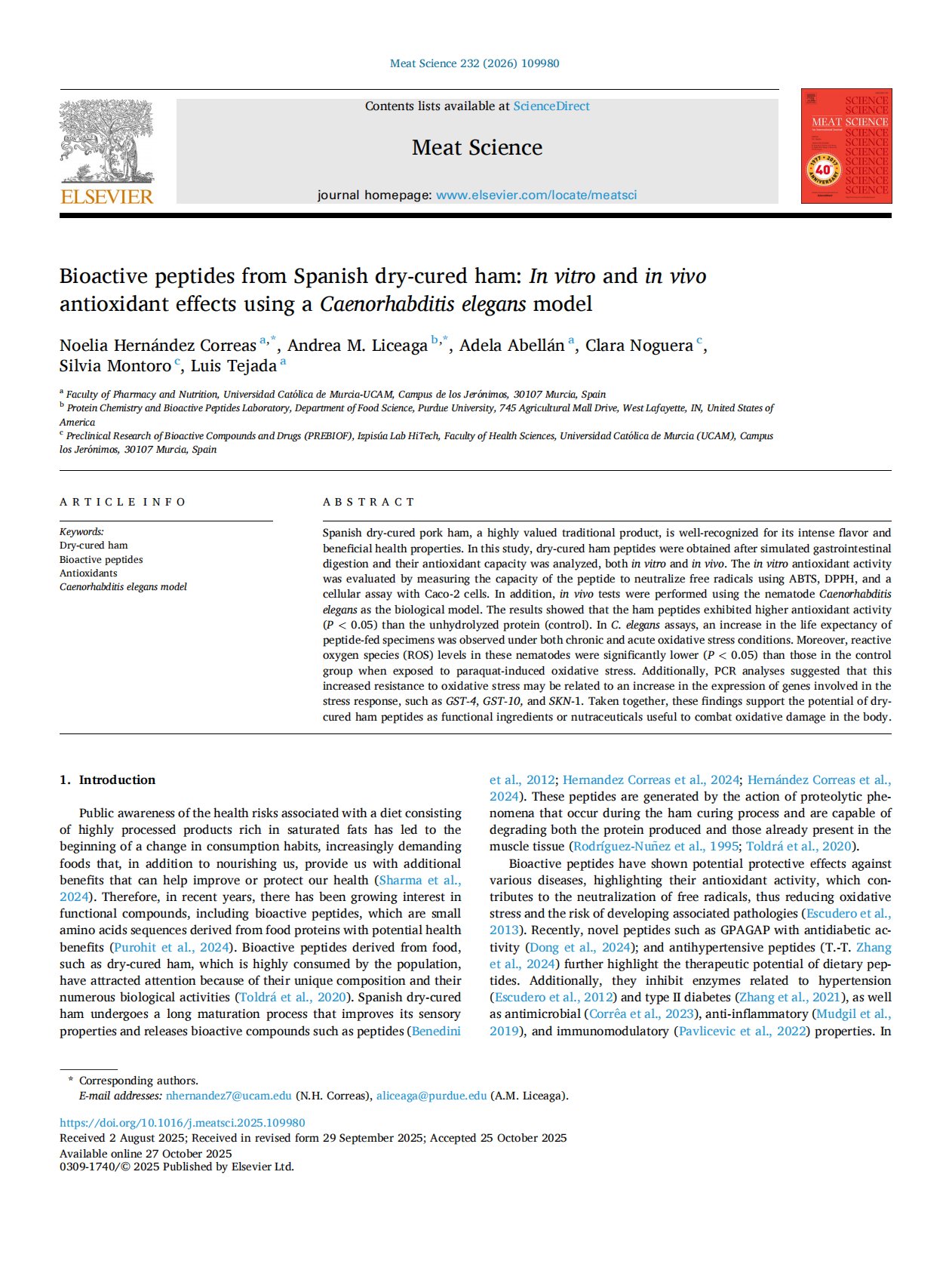 Bioactive peptides from Spanish dry-cured ham In vitro and in vivo antioxidant effects using a Caenorhabditis elegans model