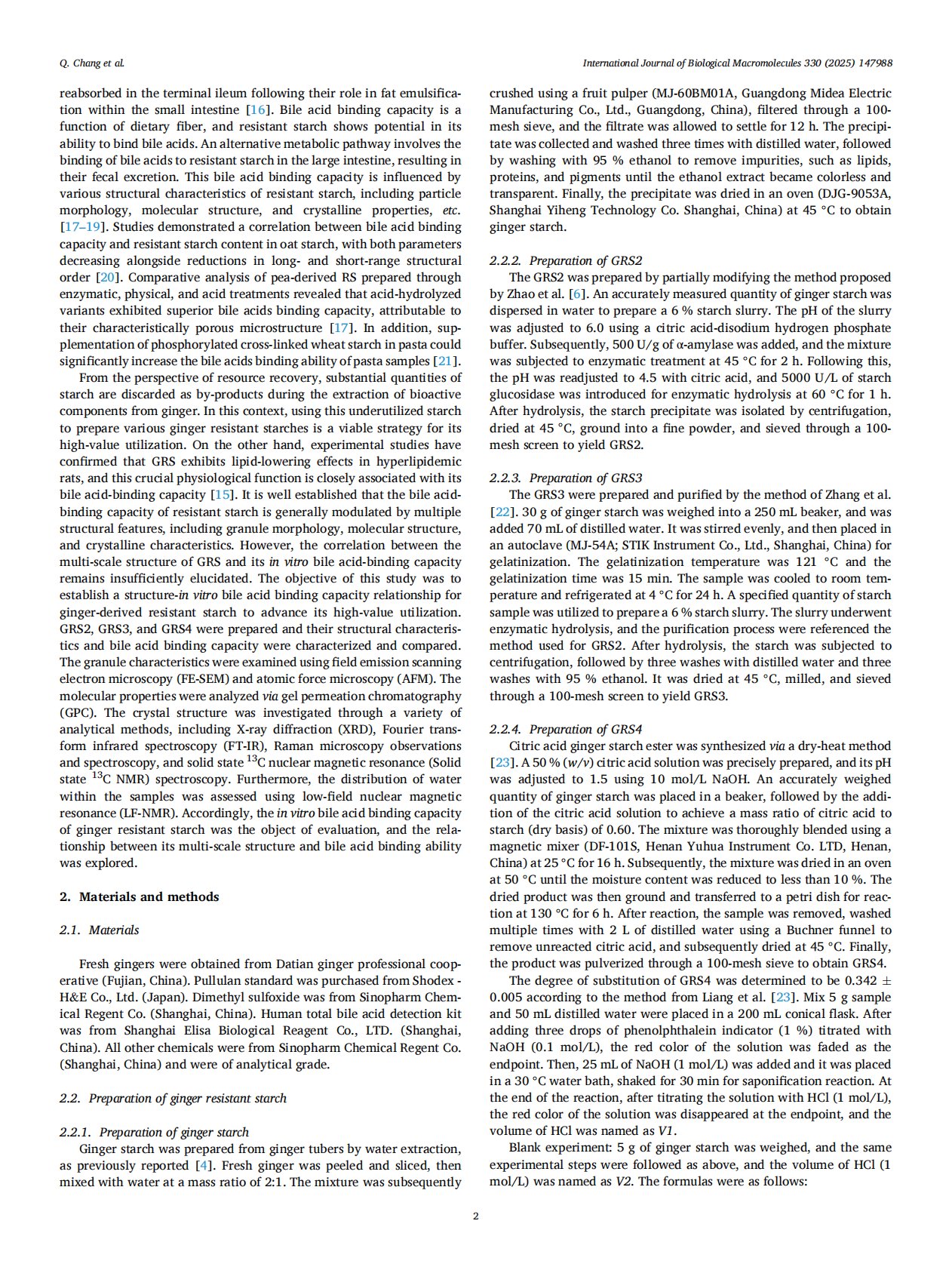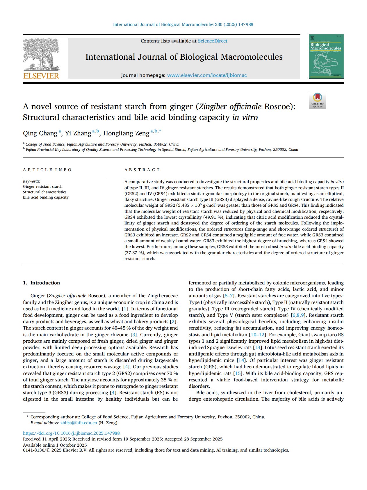 A novel source of resistant starch from ginger (Zingiber officinale Roscoe) Structural characteristics and bile acid binding capacity in vitro