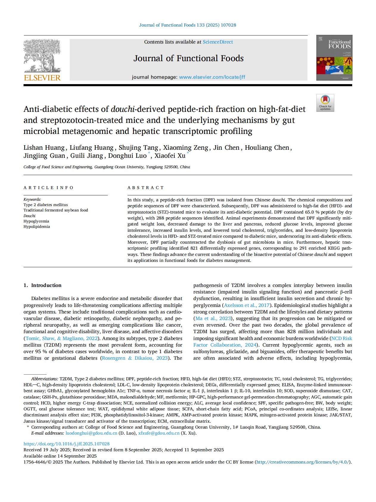 Anti-diabetic effects of douchi-derived peptide-rich fraction on high-fat-diet and streptozotocin-treated mice and the underlying mechanisms by gut microbial metagenomic and hepatic transcript