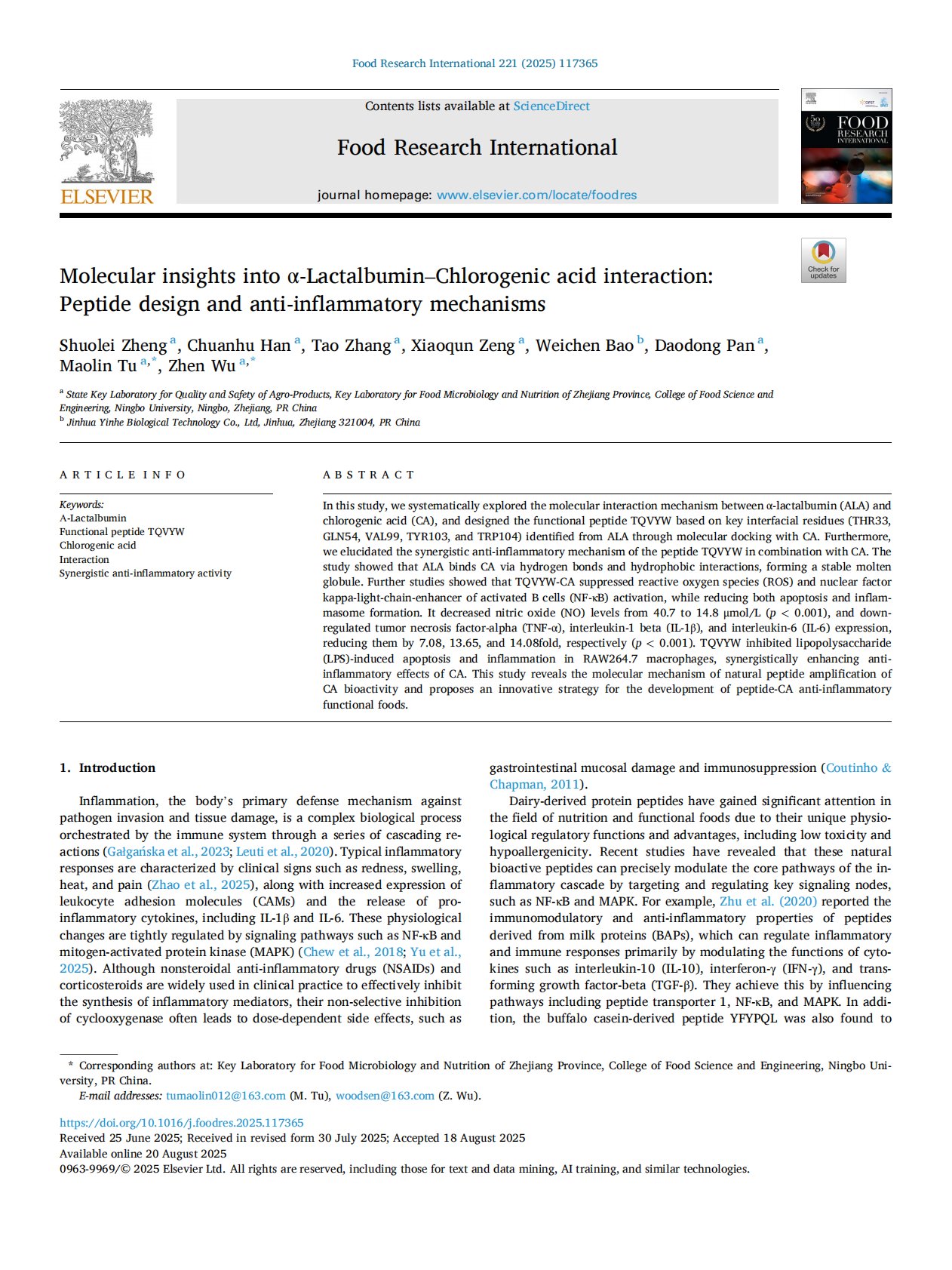 标题:Molecular insights into Lactalbumin Chlorogenic acid interaction Peptide design and antiinflammatory mechanisms