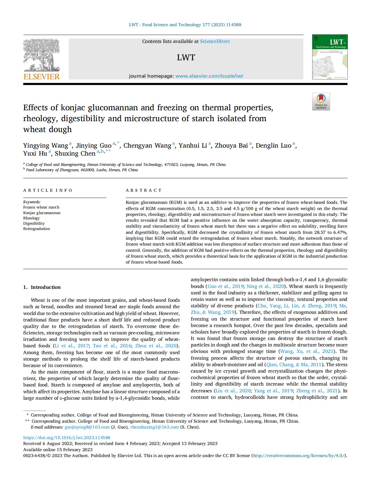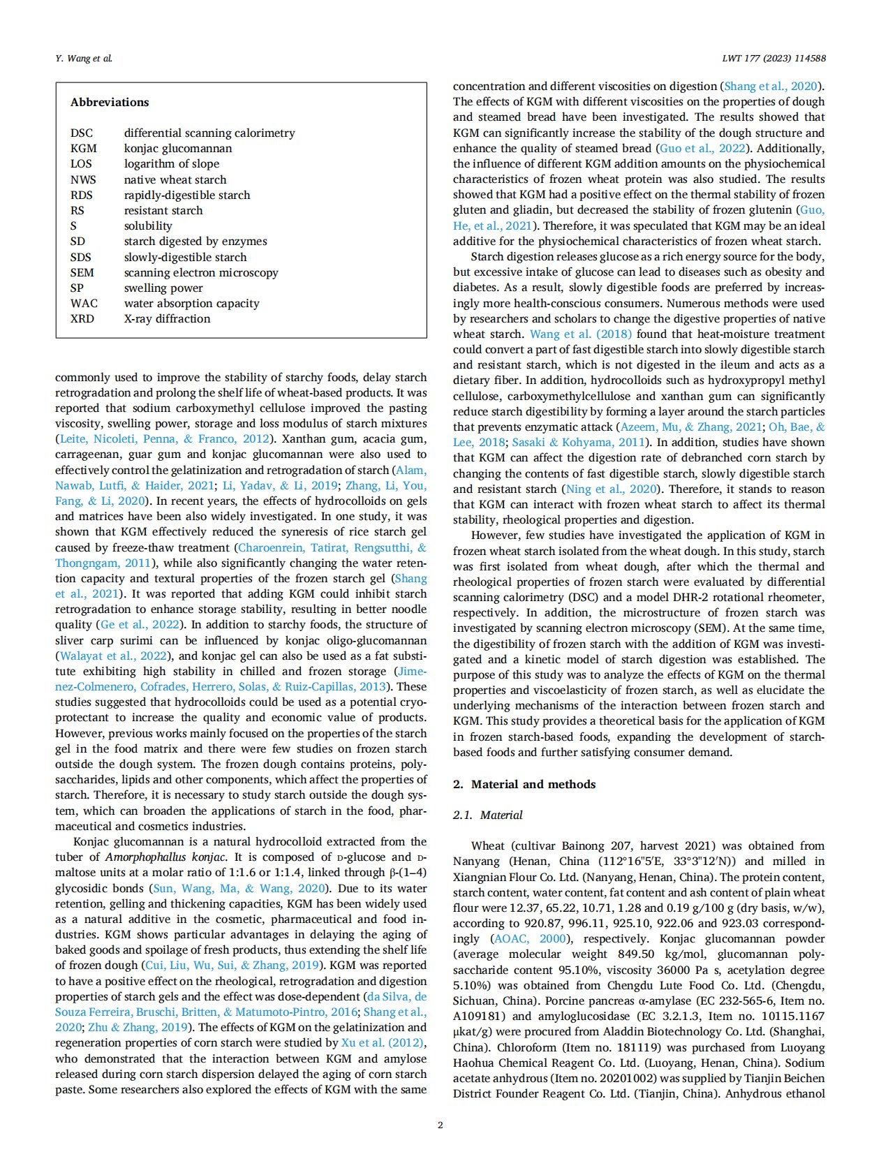 Effects of konjac glucomannan and freezing on thermal properties, rheology, digestibility and microstructure of starch isolated from wheat dough