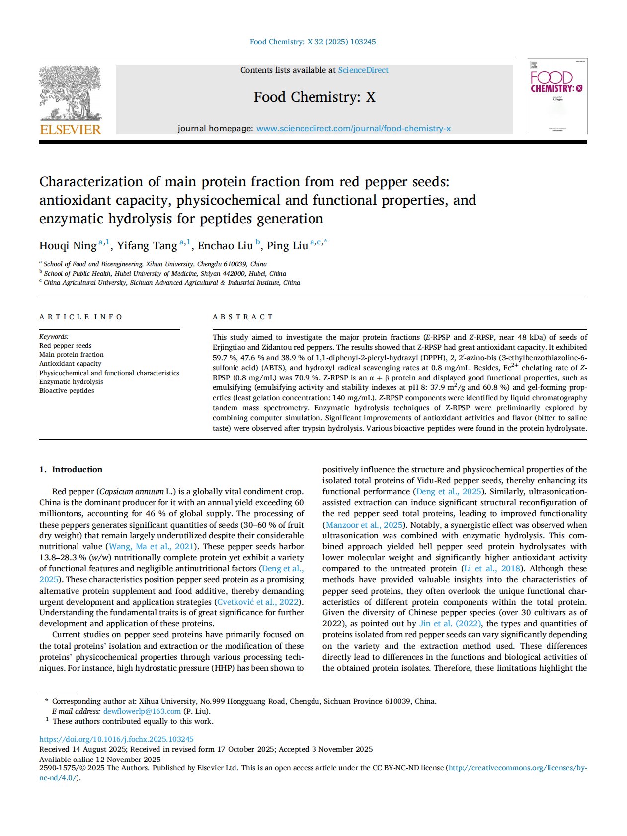 Characterization of main protein fraction from red pepper seeds antioxidant capacity, physicochemical and functional properties, and enzymatic hydrolysis for peptides generation