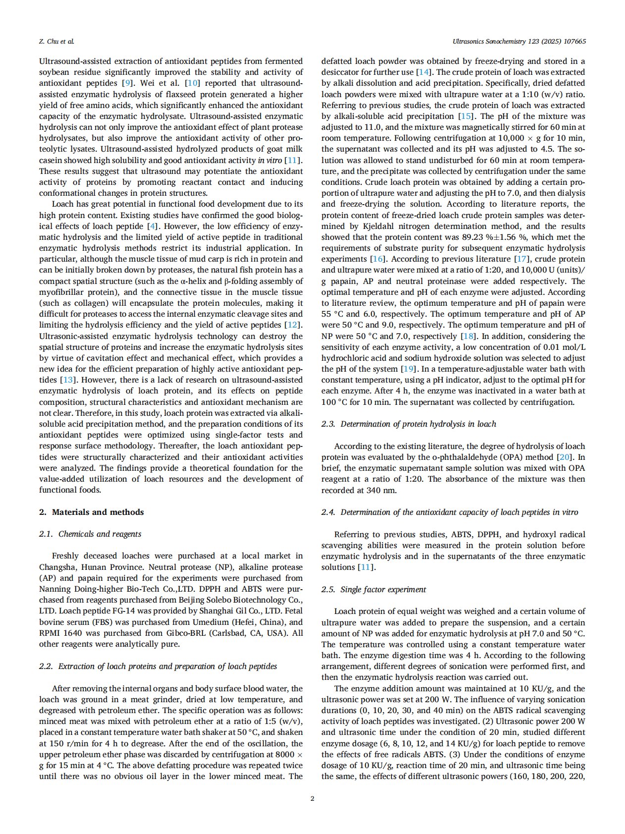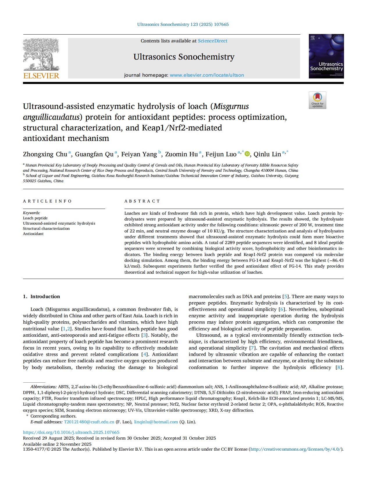 Ultrasound-assisted enzymatic hydrolysis of loach (Misgurnus anguillicaudatus) protein for antioxidant peptides process optimization, structural characterization, and Keap1Nrf2-mediated antioxidant mechanism