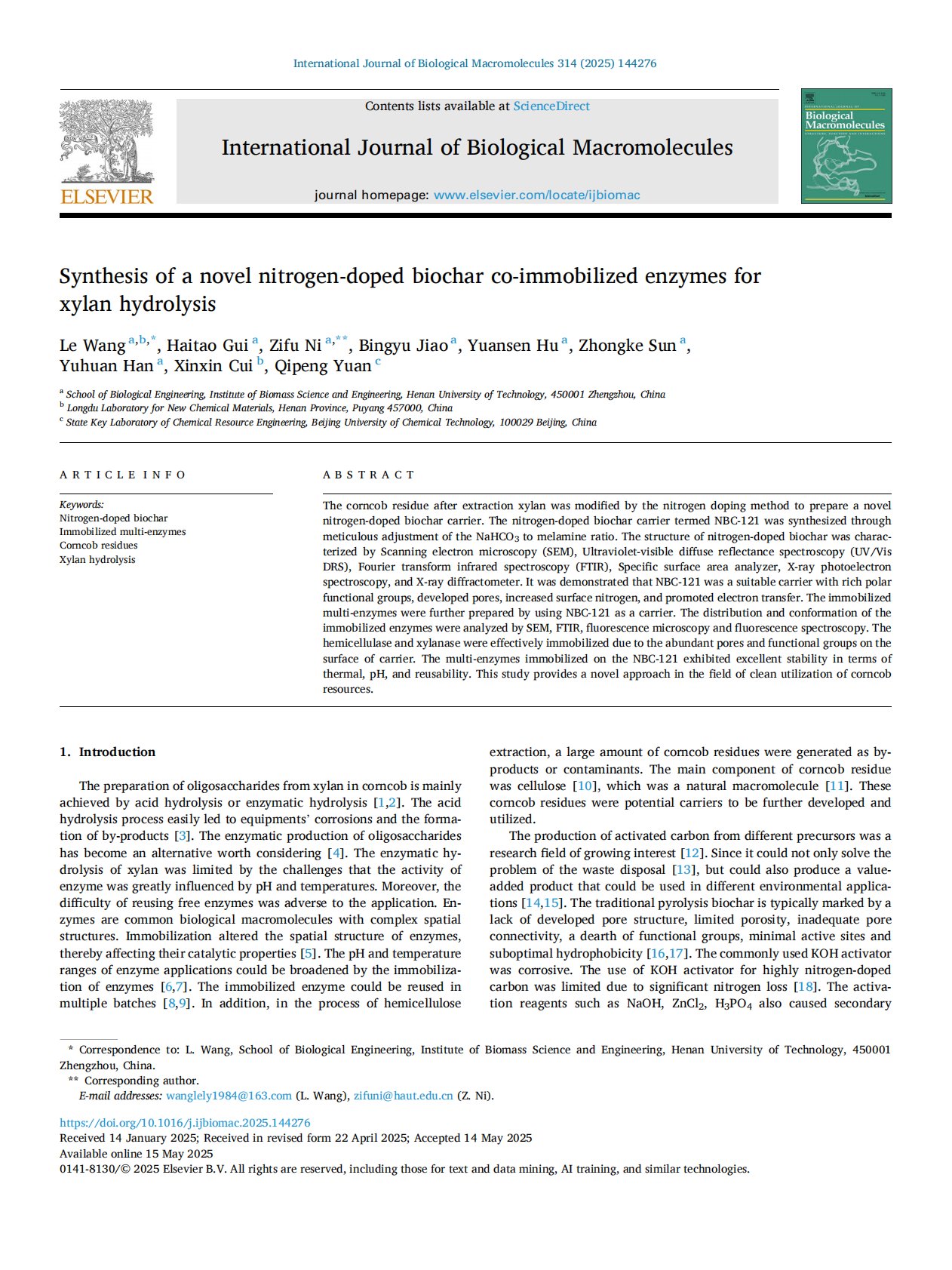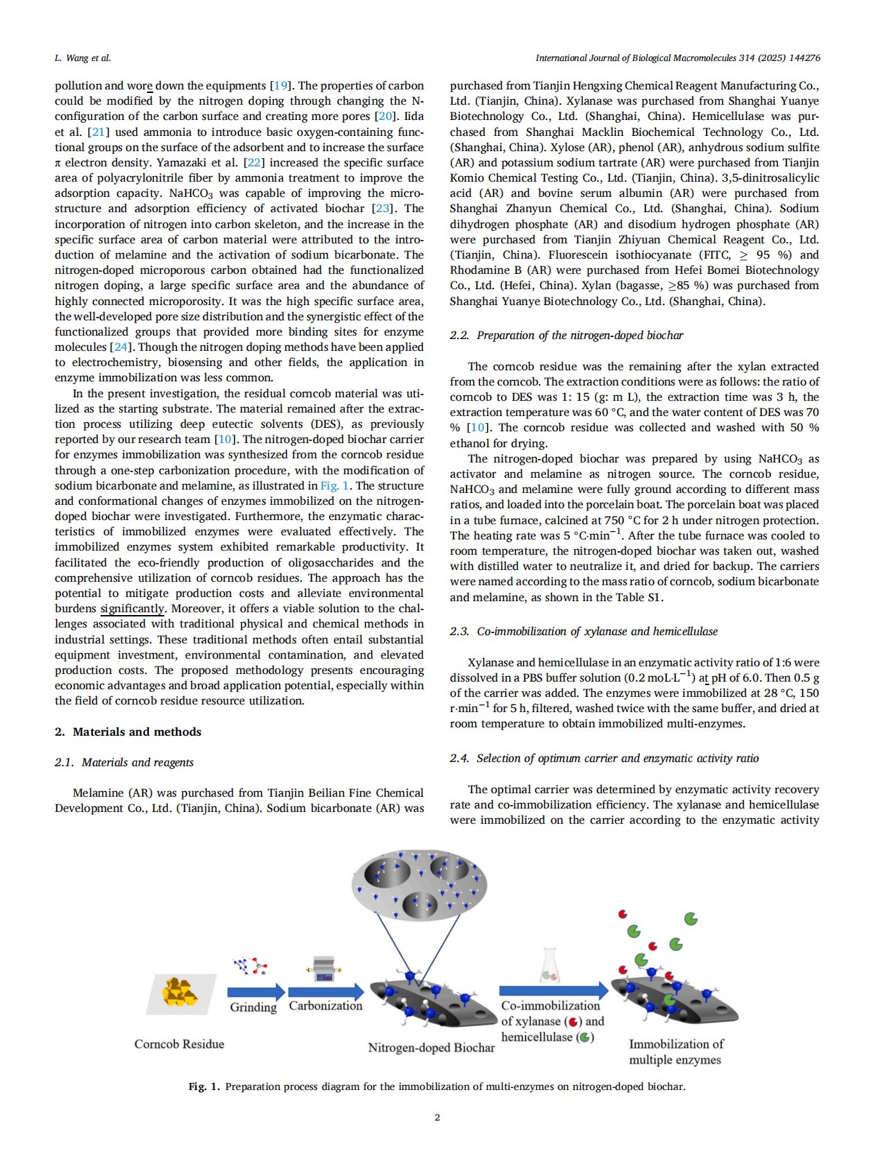 标题:Synthesis of a novel nitrogen-doped biochar co-immobilized enzymes for xylan hydrolysis