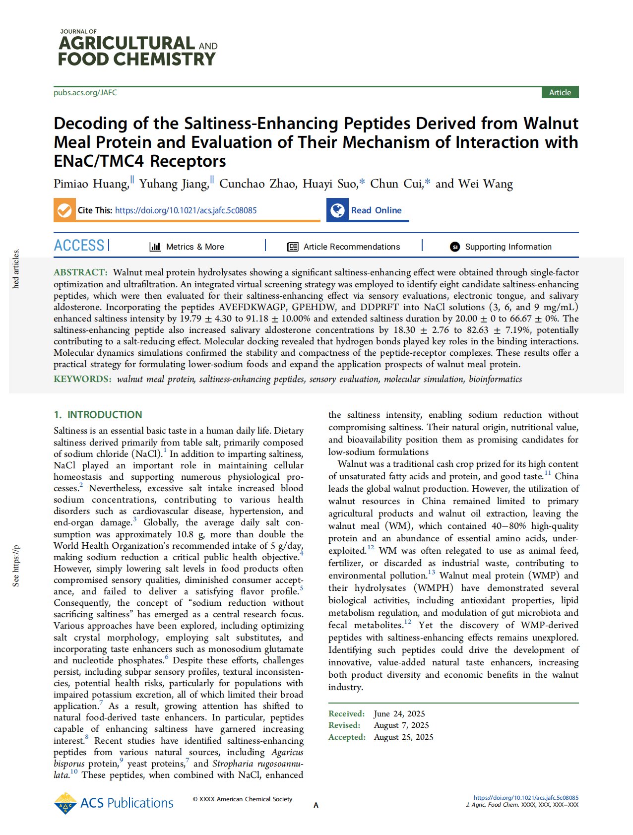 Decoding of the Saltiness-Enhancing Peptides Derived from Walnut Meal Protein and Evaluation of Their Mechanism of Interaction with ENaCTMC4 Receptors