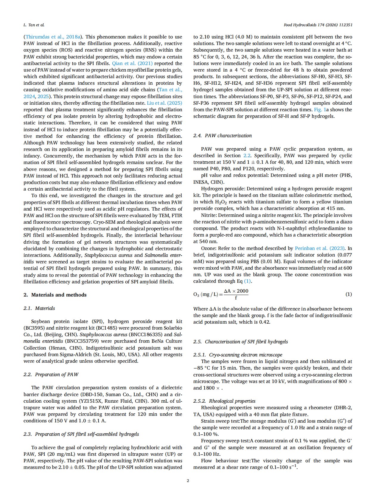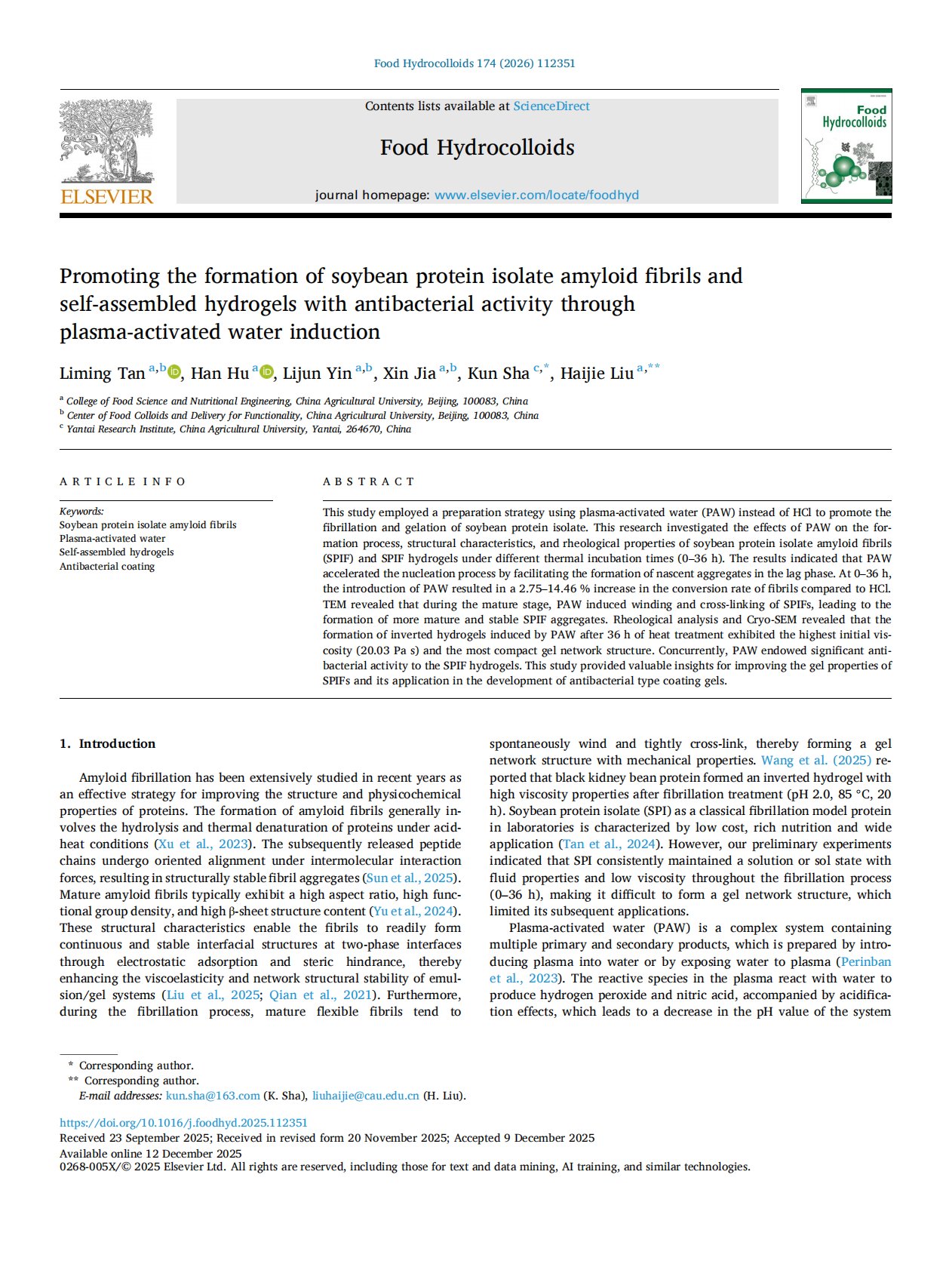 Promoting the formation of soybean protein isolate amyloid fibrils and self-assembled hydrogels with antibacterial activity through plasma-activated water induction