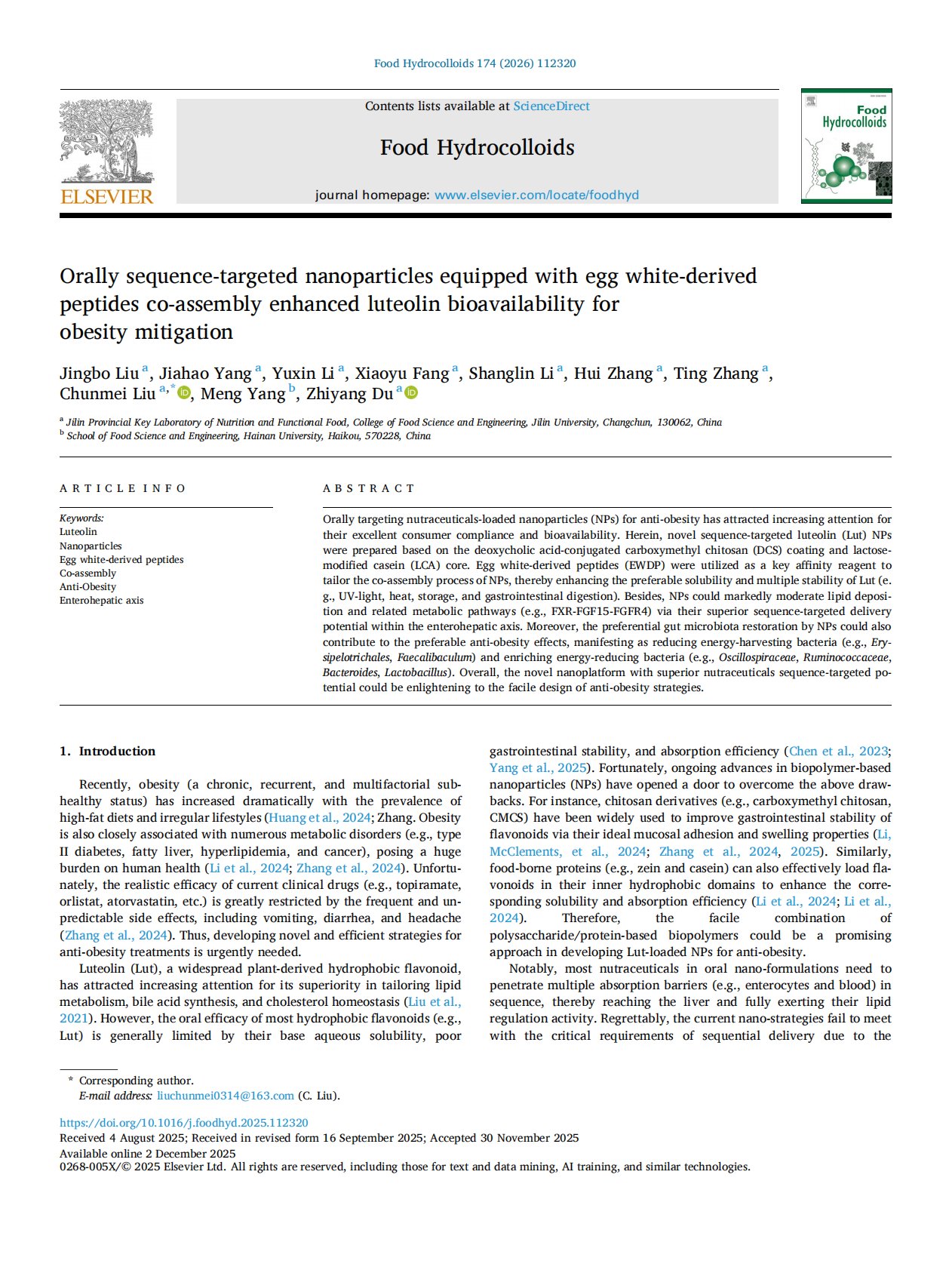 Orally sequence-targeted nanoparticles equipped with egg white-derived peptides co-assembly enhanced luteolin bioavailability for obesity mitigation