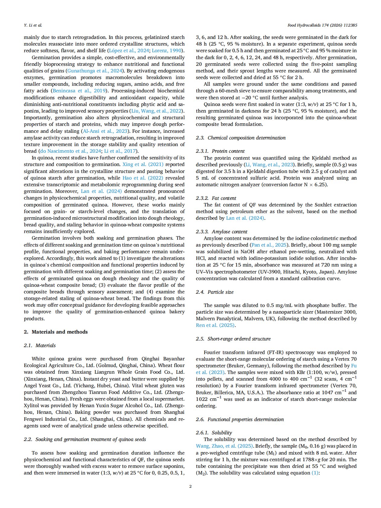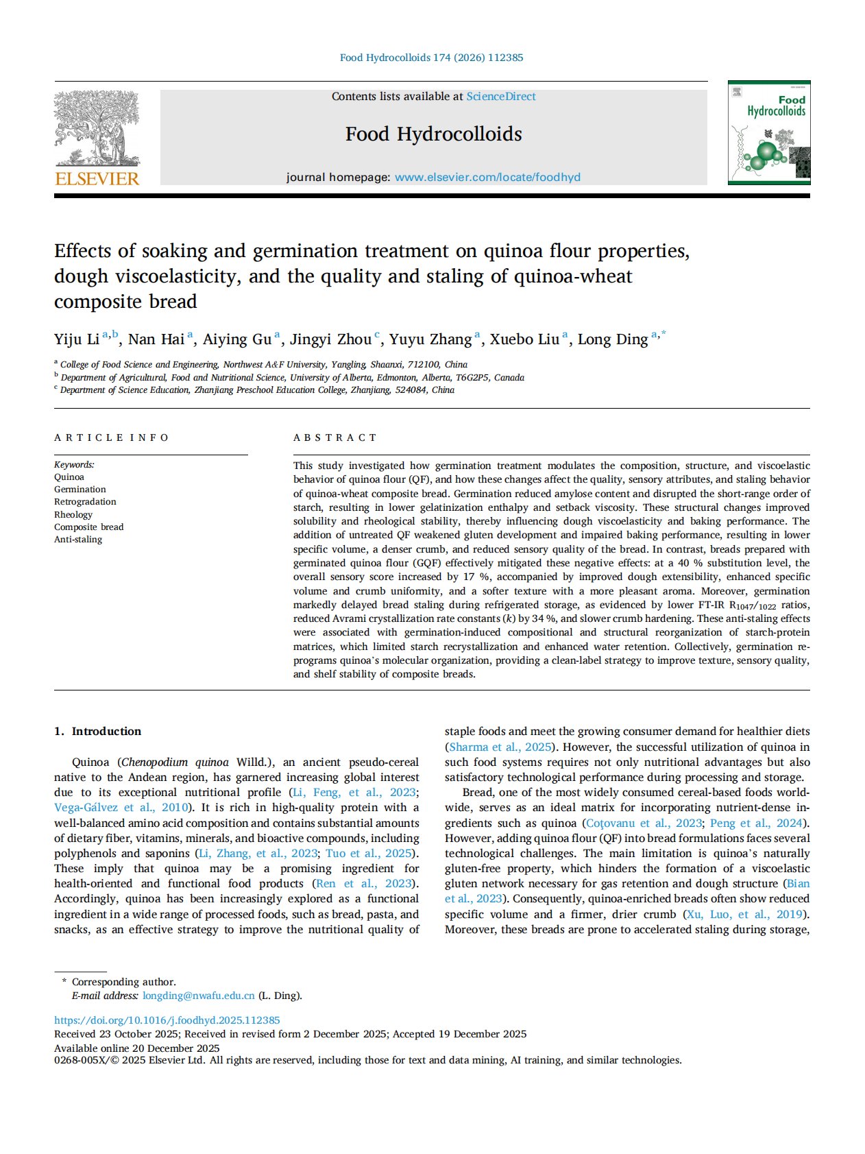 Effects of soaking and germination treatment on quinoa flour properties, dough viscoelasticity, and the quality and staling of quinoa-wheat composite bread