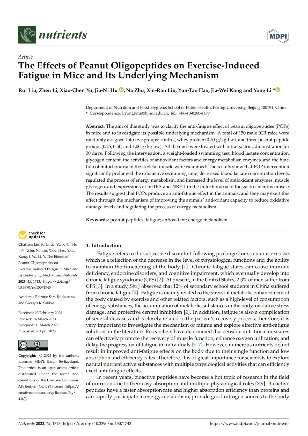 The Effects of Peanut Oligopeptides on Exercise-Induced Fatigue in Mice and Its Underlying Mechanism.pdf