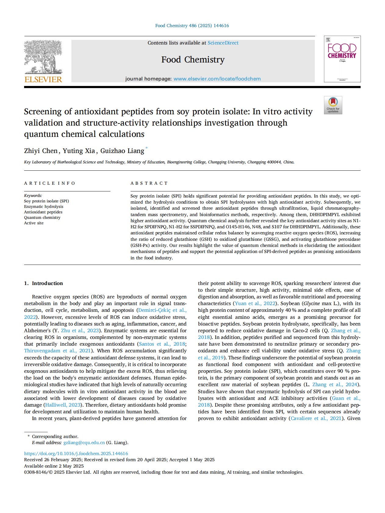 Screening of antioxidant peptides from soy protein isolate: In vitro activity validation and structure-activity relationships investigation through quantum chemical calculations