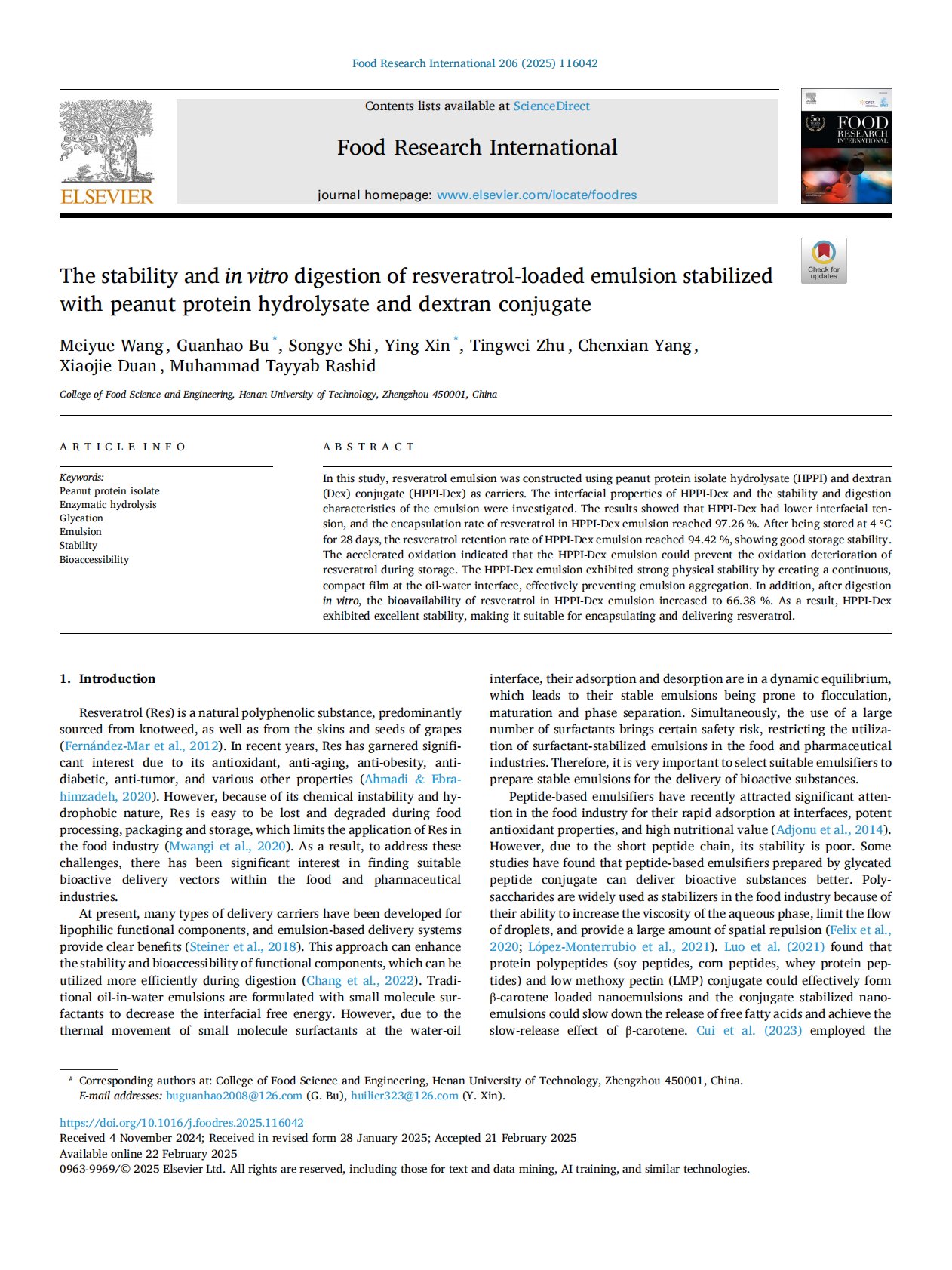 The stability and in vitro digestion of resveratrol-loaded emulsion stabilized with peanut protein hydrolysate and dextran conjugate