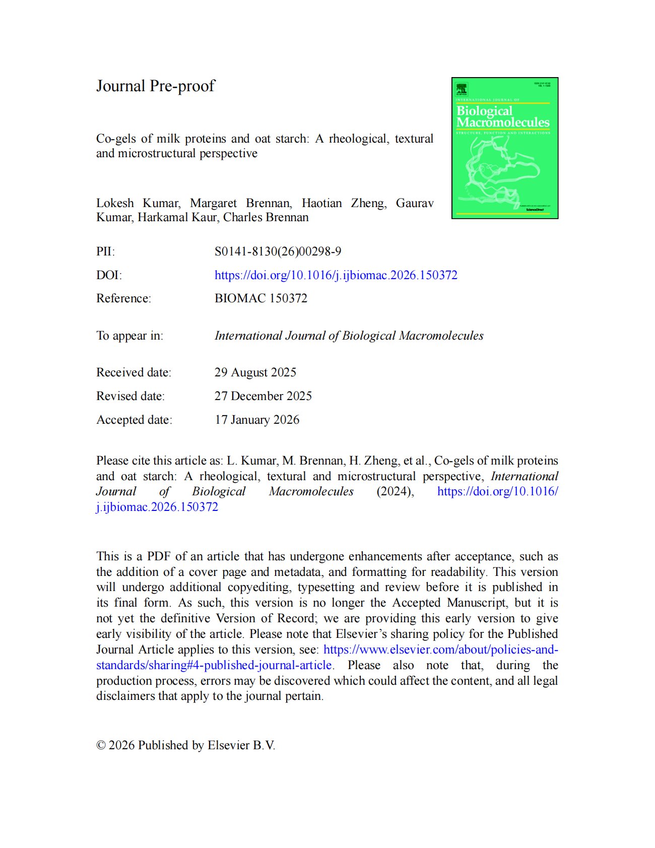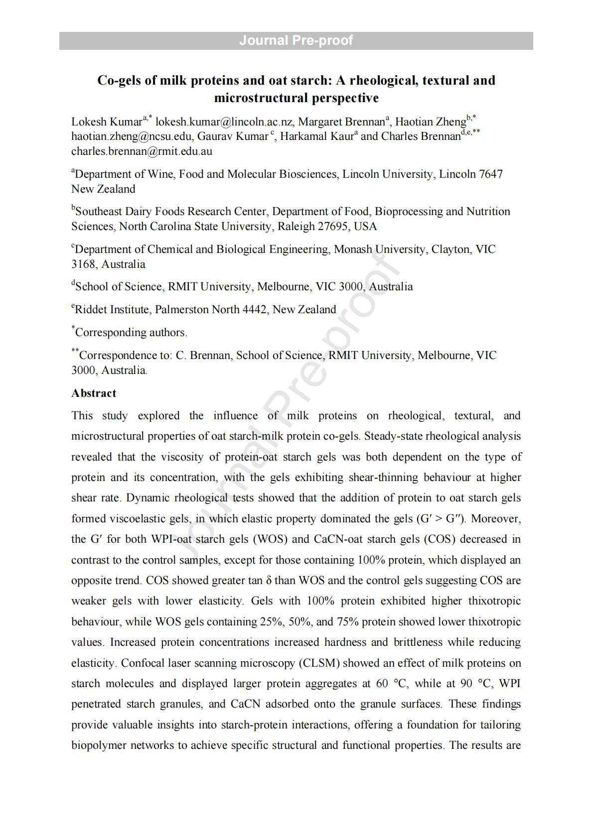 标题:Co-gels of milk proteins and oat starch: A rheological, textural and microstructural perspective
