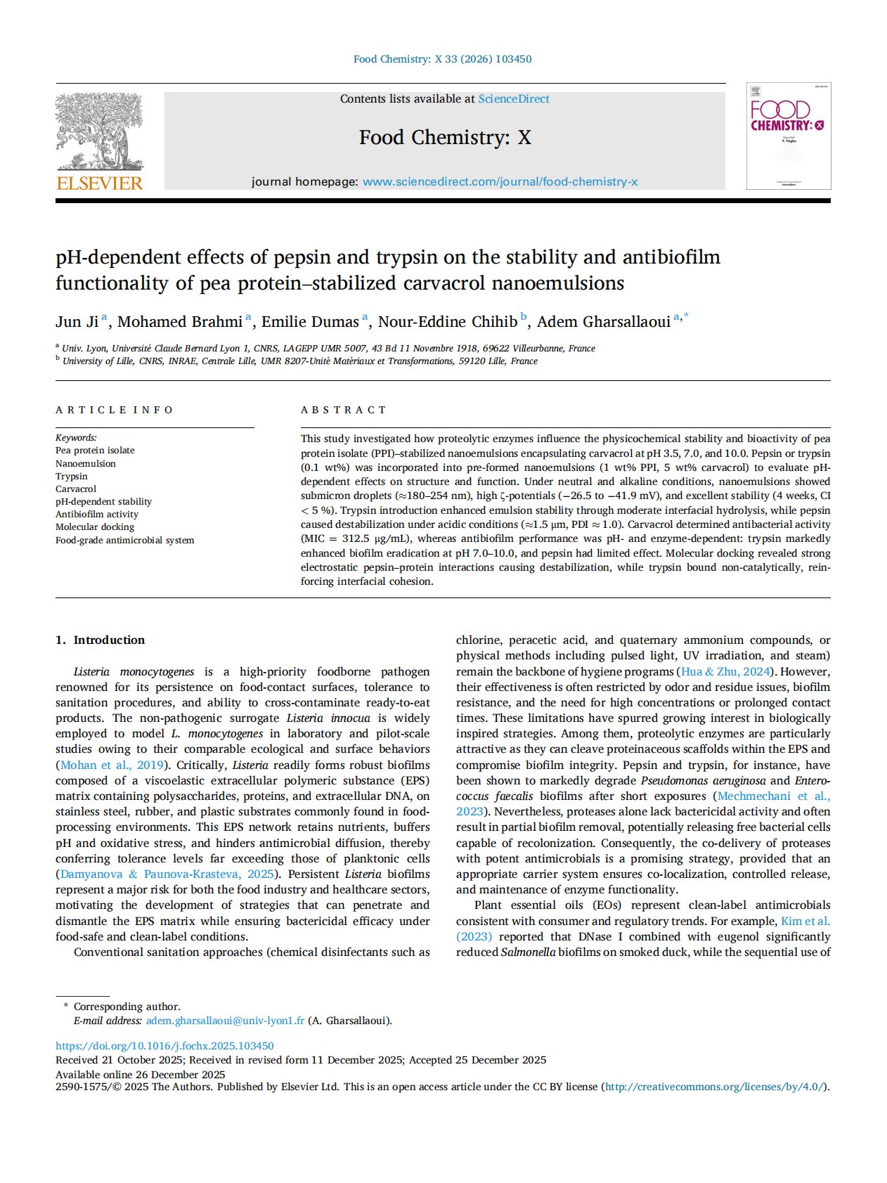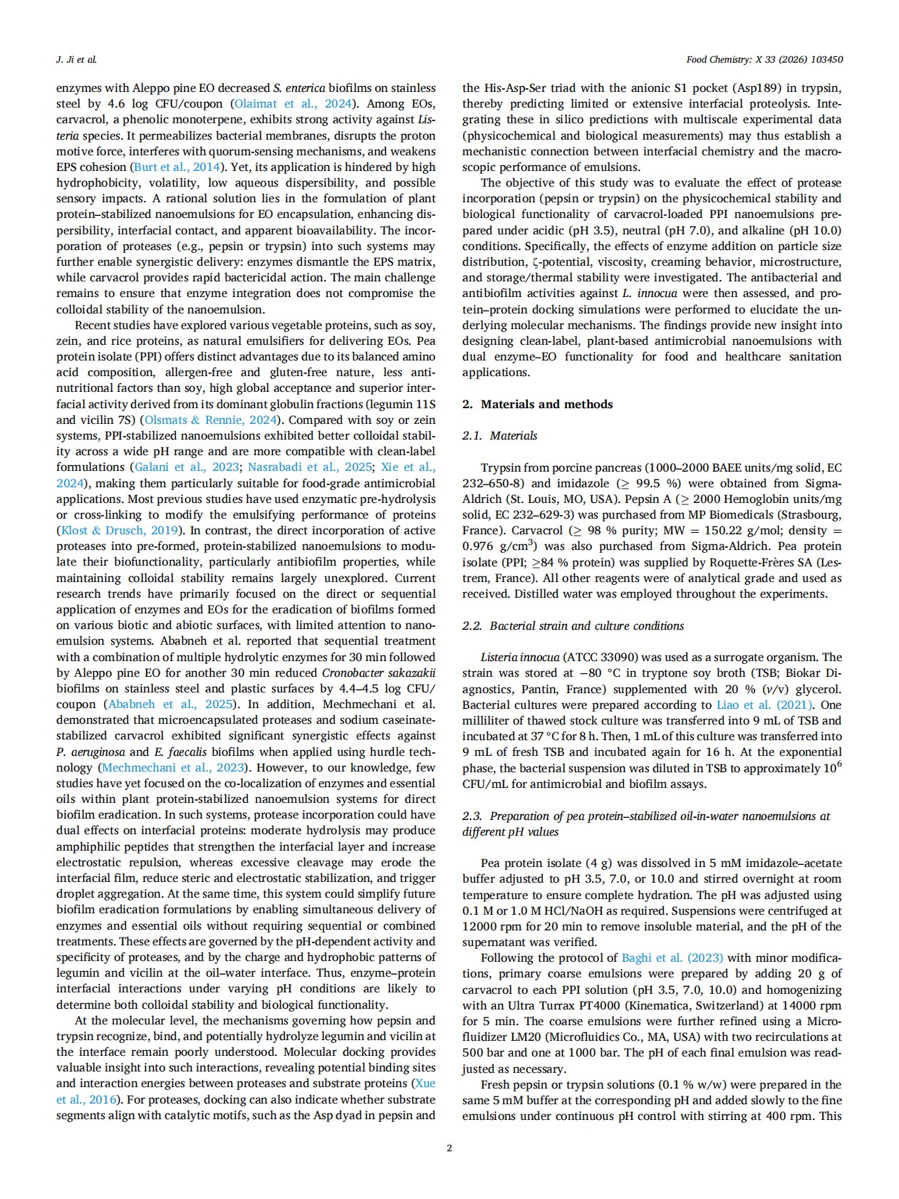 pH-dependent effects of pepsin and trypsin on the stability and antibiofilm functionality of pea protein–stabilized carvacrol nanoemulsions