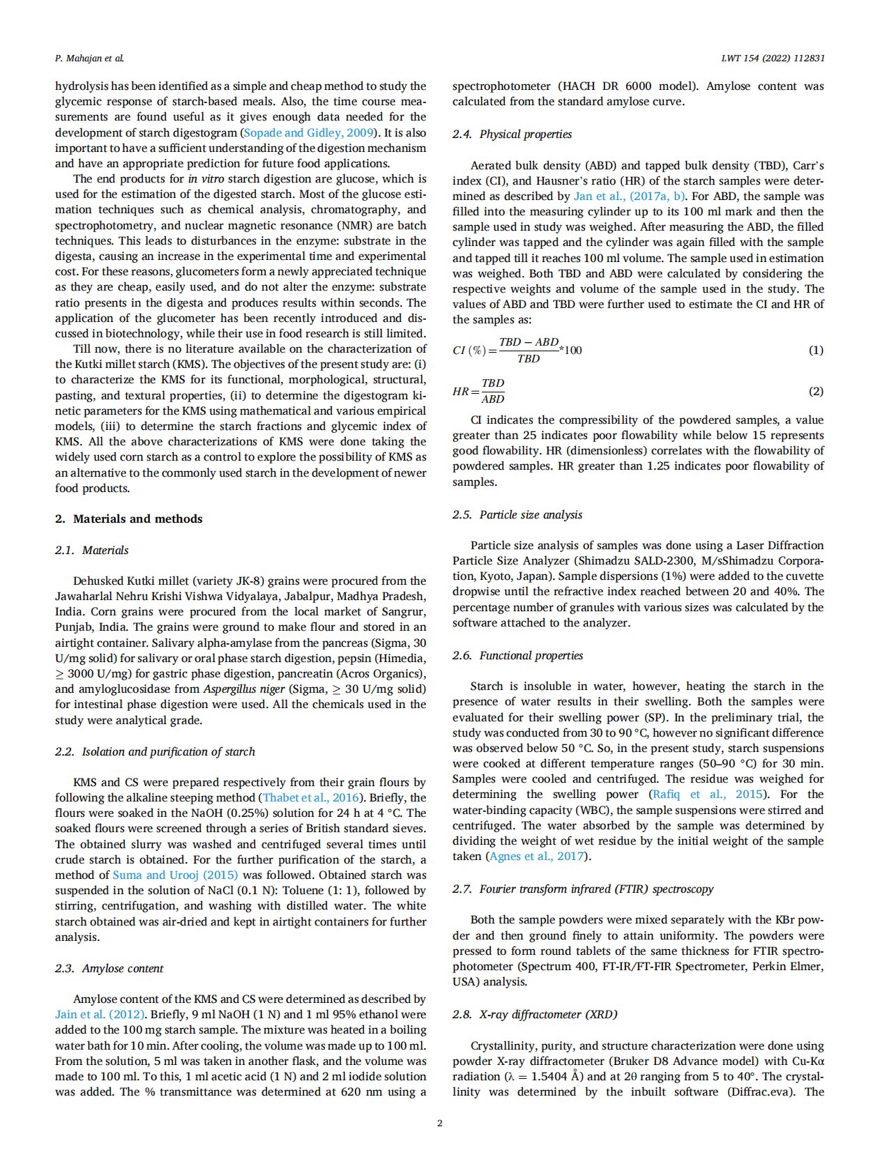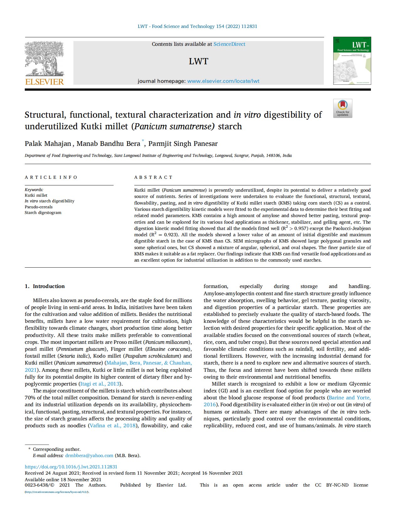 Structural, functional, textural characterization and in vitro digestibility of underutilized Kutki millet (Panicum sumatrense) starch