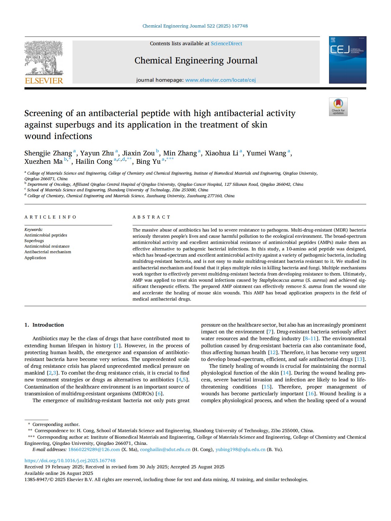 Screening of an antibacterial peptide with high antibacterial activity against superbugs and its application in the treatment of skin wound infections