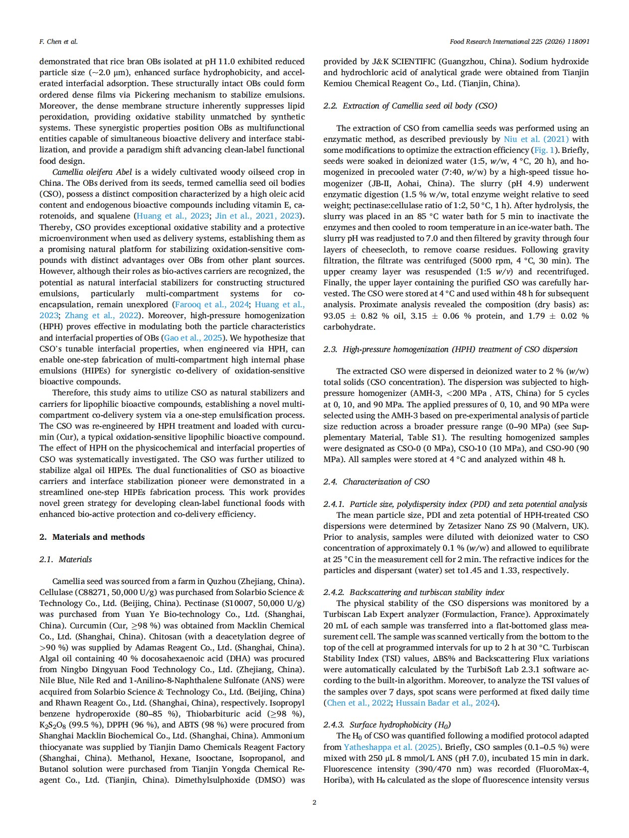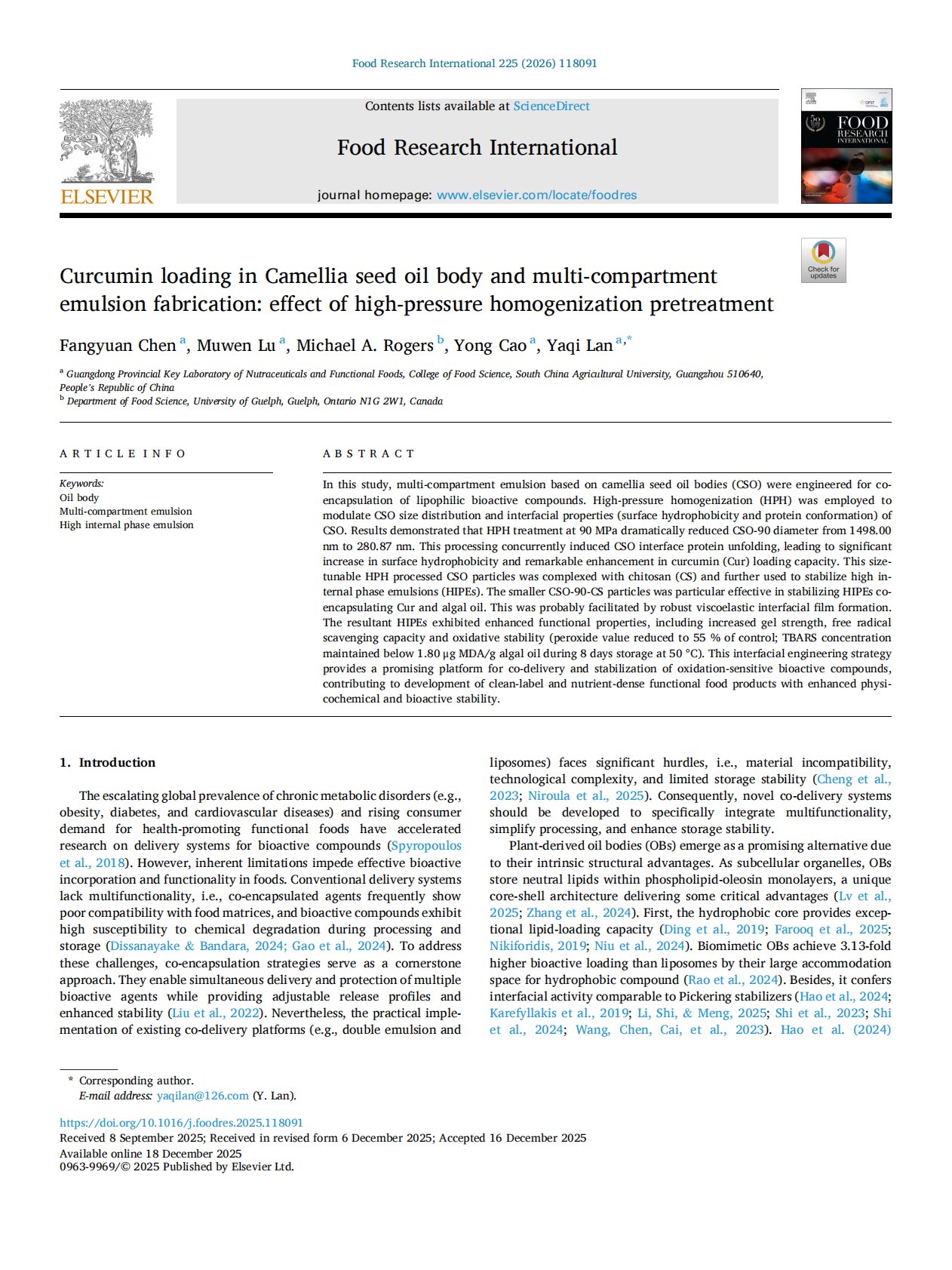 Curcumin loading in Camellia seed oil body and multi-compartment emulsion fabrication: effect of high-pressure homogenization pretreatment