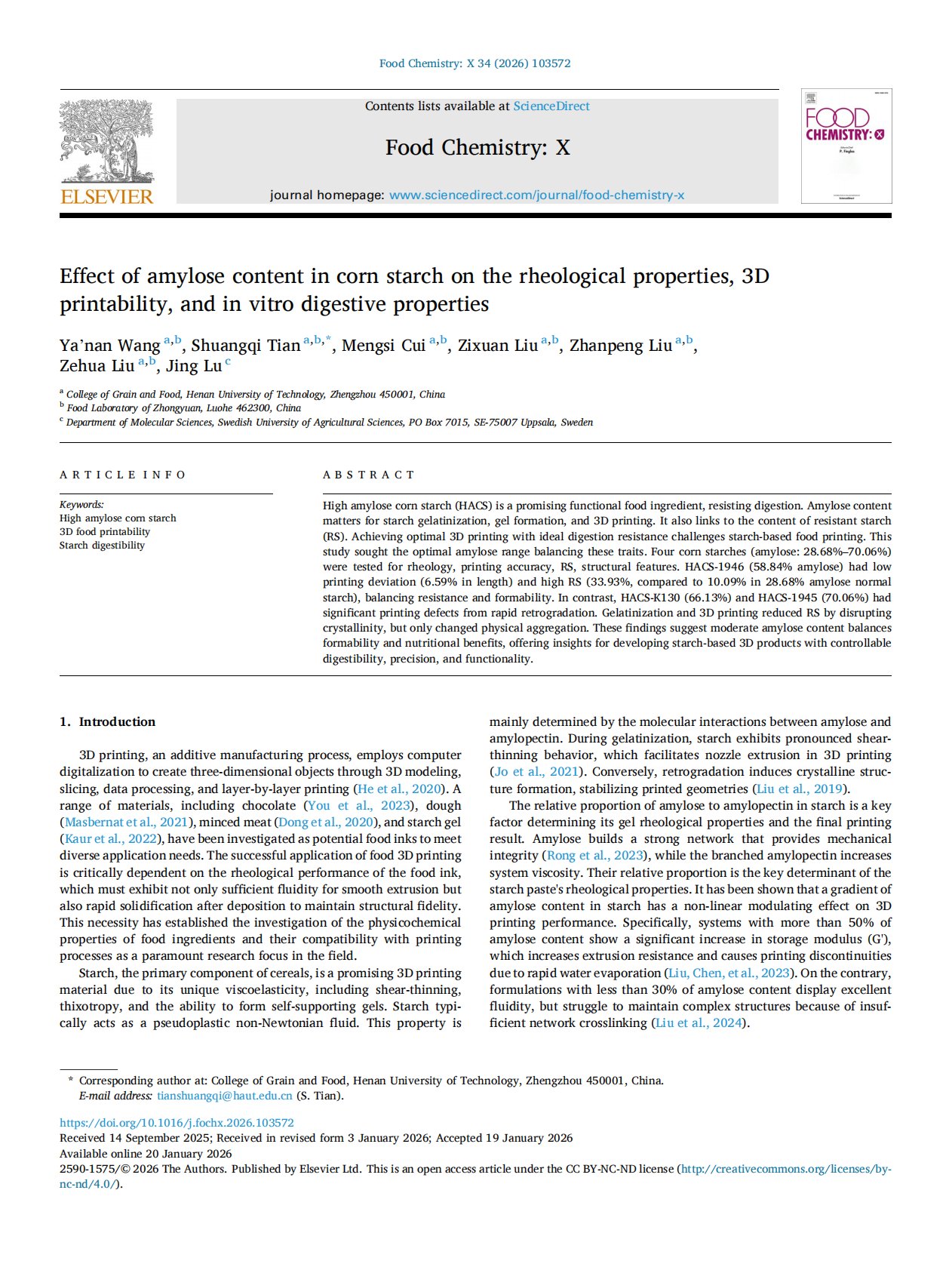 Effect of amylose content in corn starch on the rheological properties, 3D printability, and in vitro digestive properties