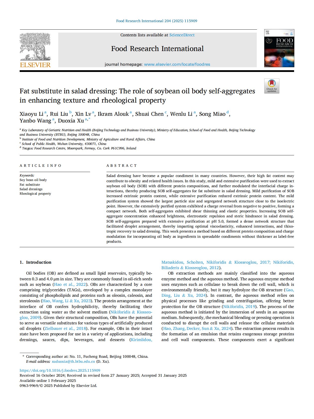 Fat substitute in salad dressing: The role of soybean oil body self-aggregates in enhancing texture and rheological property