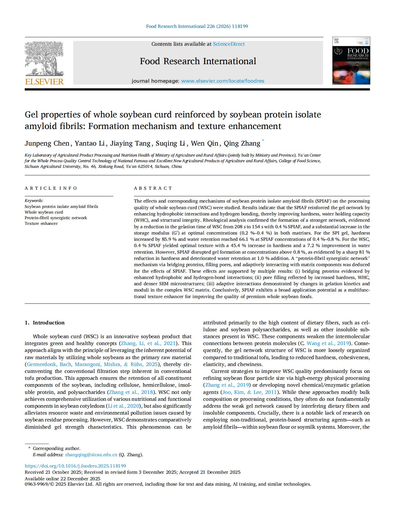 Gel properties of whole soybean curd reinforced by soybean protein isolate amyloid fibrils: Formation mechanism and texture enhancement