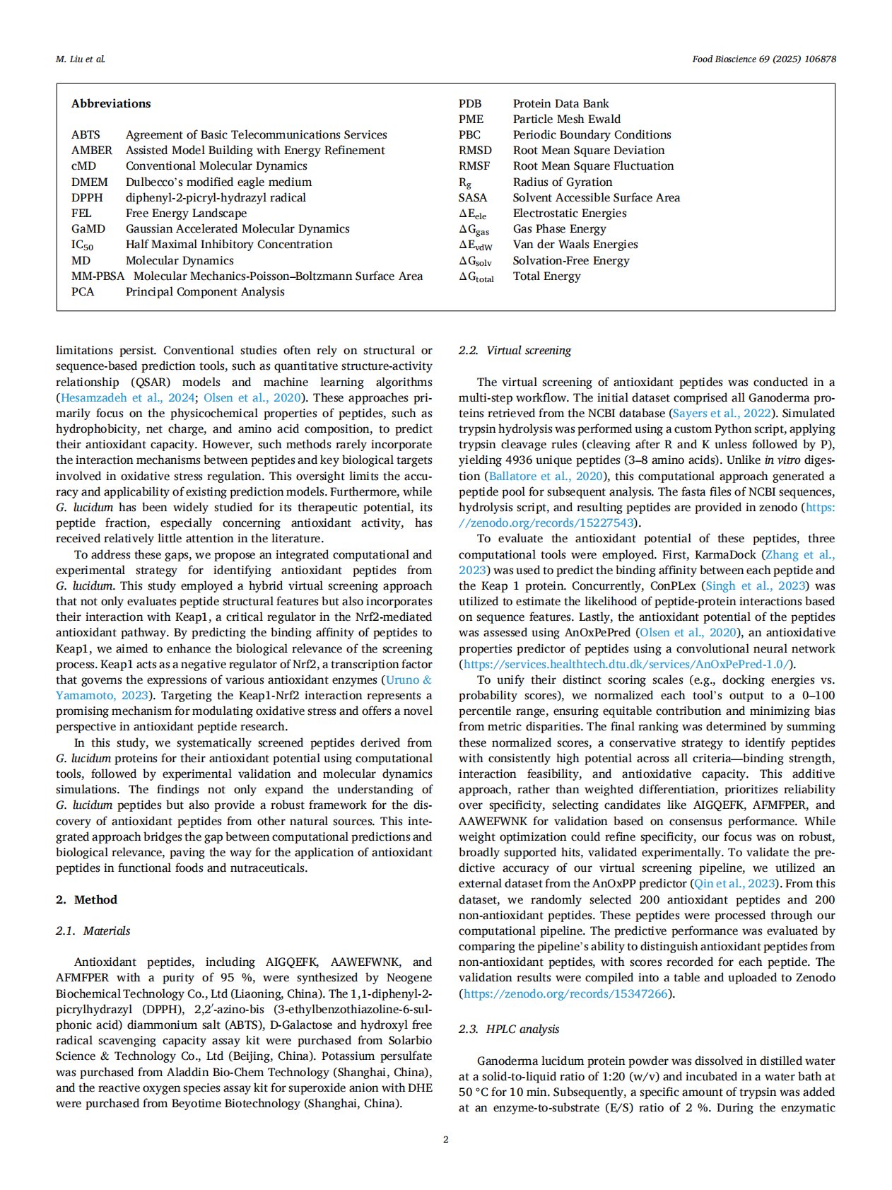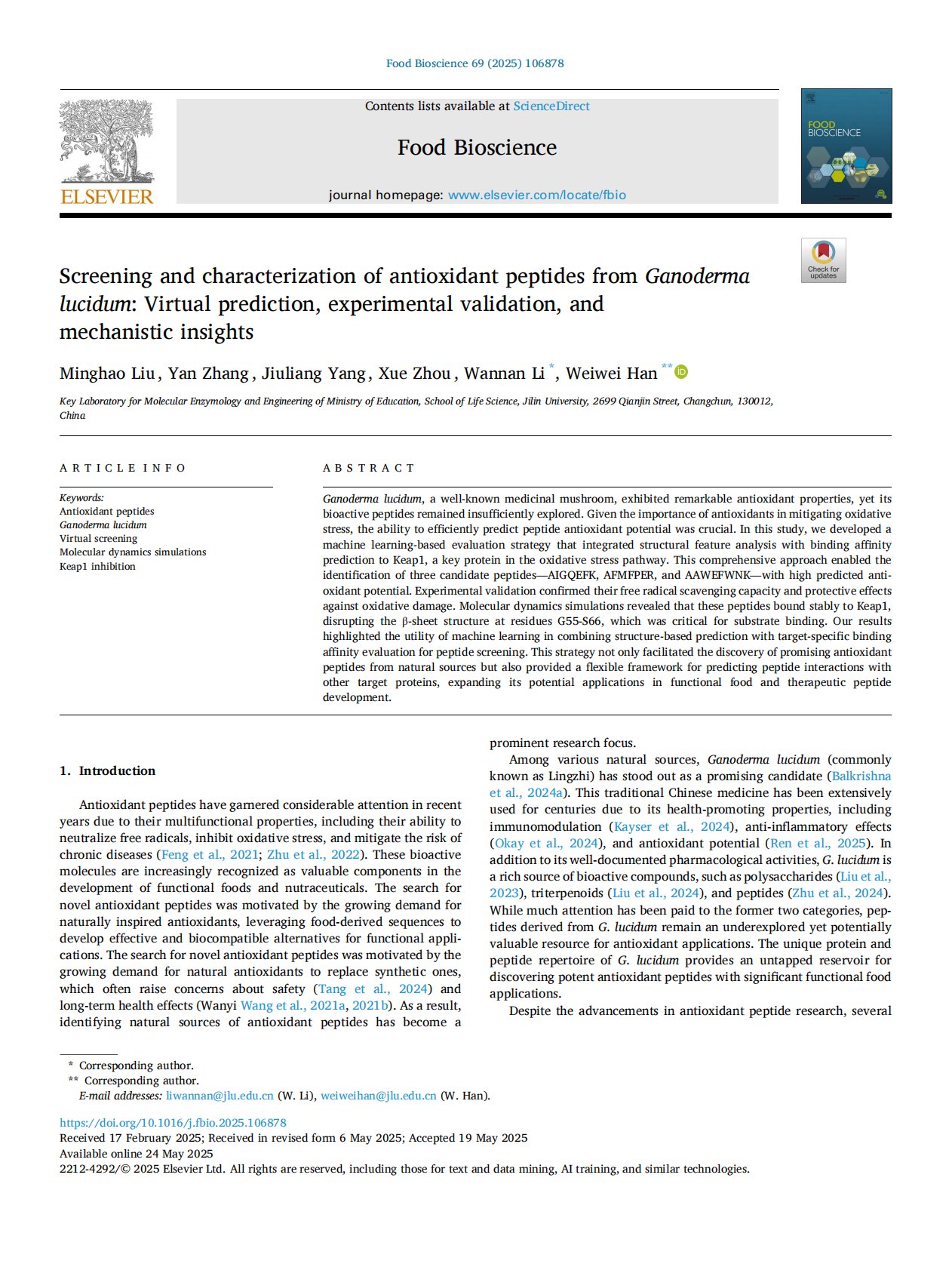 Screening and characterization of antioxidant peptides from Ganoderma lucidum: Virtual prediction, experimental validation, and mechanistic insights