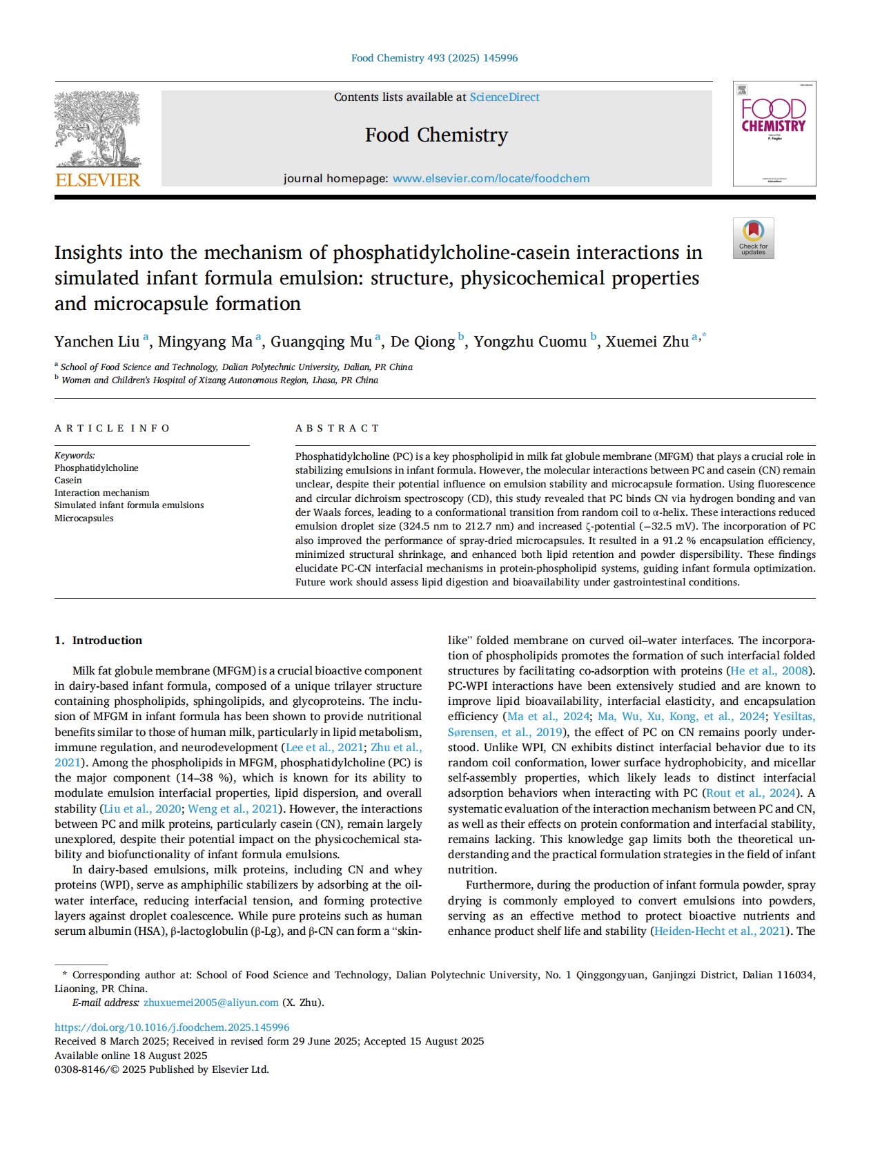 Insights into the mechanism of phosphatidylcholine-casein interactions in simulated infant formula emulsion: structure, physicochemical properties and microcapsule formation