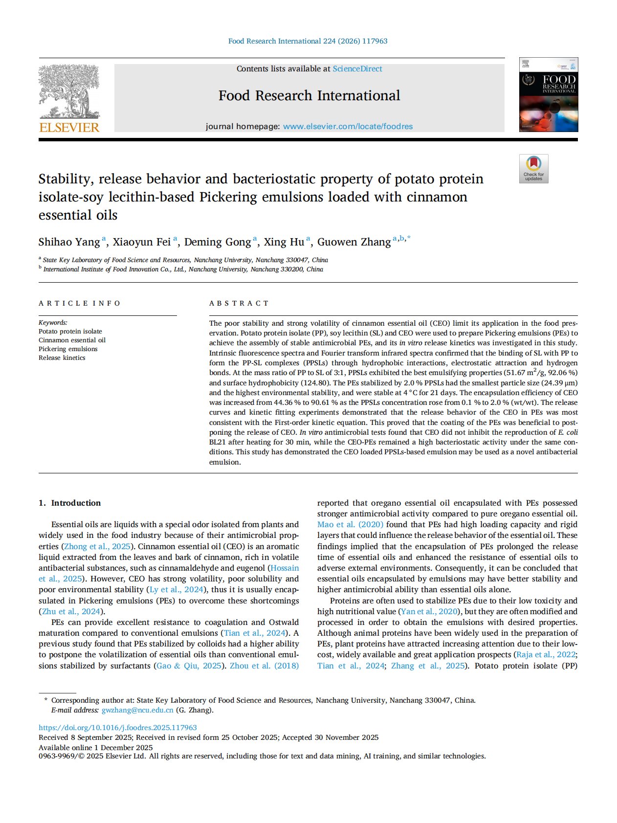 Stability, release behavior and bacteriostatic property of potato protein isolate-soy lecithin-based Pickering emulsions loaded with cinnamon essential oil